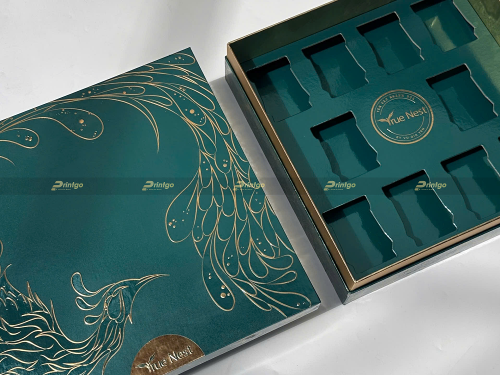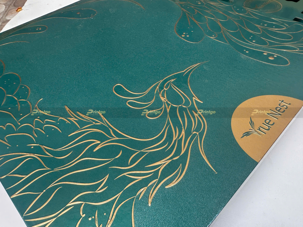 Gia công sau in là công đoạn quan trọng không thể bỏ qua đối với các sản phẩm in ấn. Khi in hộp đựng yến TrueNest, Printgo đã lựa chọn ép kim để tạo nên sự sang trọng cho bao bì. Nhờ quá trình sử dụng nhiệt và áp lực để ép một lớp kim loại mỏng lên bề mặt sản phẩm in thông qua khuôn in mà cho ra những hiệu ứng sáng bóng, nổi bật và sang trọng. Ngoài ra, đối với hai hộp đựng yến chưng, Printgo áp dụng công nghệ gia công cán màng tơ tằm. Đây là quá trình phủ một lớp màng mỏng có chứa các sợi tơ tằm lên bề mặt sản phẩm in ấn. Lớp màng này tạo nên hiệu ứng lấp lánh, óng ánh như những ngôi sao trên bầu trời, mang đến vẻ đẹp sang trọng và tinh tế cho sản phẩm.