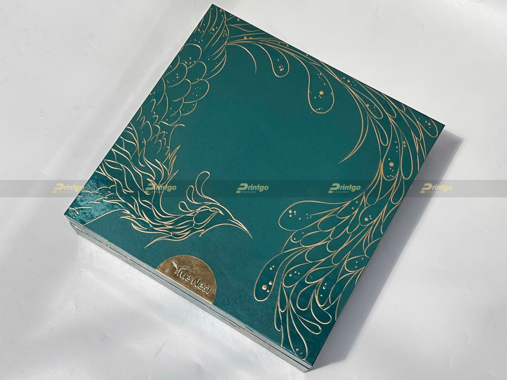 Mẫu hộp thứ 2 lại mang phong cách sang trọng, lấy hình ảnh loài chim quý làm điểm nhấn. Hình ảnh được cách điệu tinh xảo trên nền xanh trầm sang trọng, tạo nên một tổng thể hài hòa và đầy sức hút.