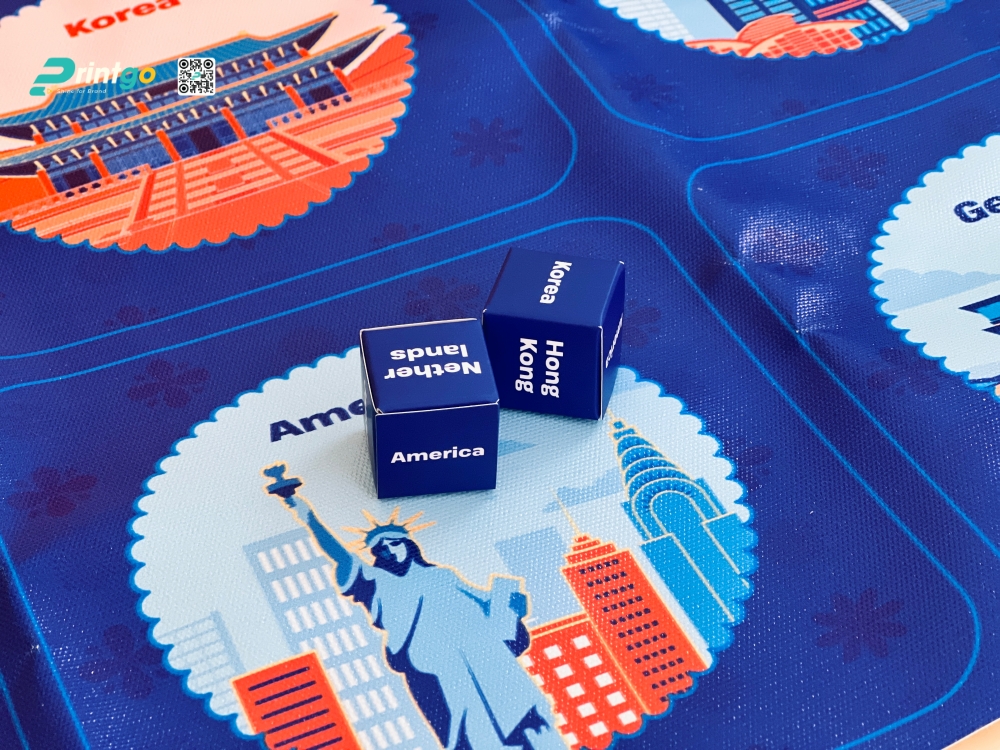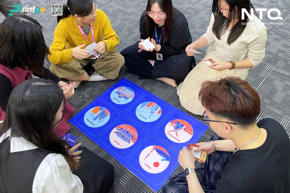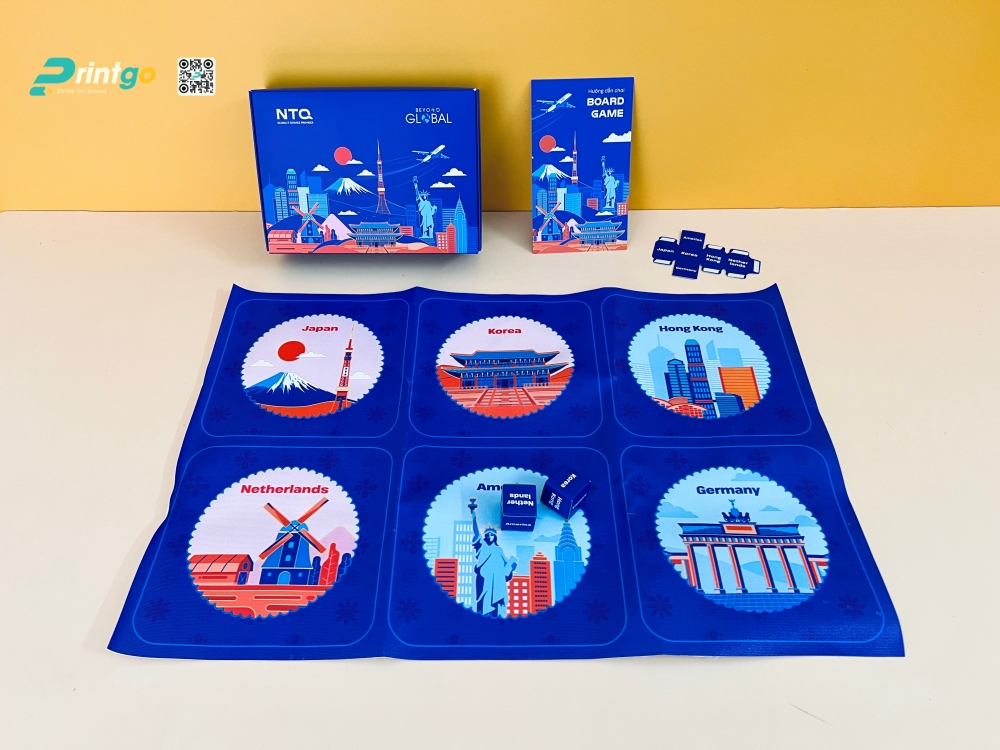 Các thành phần trò chơi: Bộ sản phẩm bao gồm một bàn cờ. Điểm độc đáo nhất là ở thiết kế bàn cờ: thay vì sử dụng hình ảnh Bầu Cua Tôm Cá truyền thống, đội ngũ sáng tạo của Printgo đã thiết kế một "chặng đua" với các ô cờ là chính những địa danh toàn cầu có trụ sở NTQ. Đây chính là cách kể chuyện thương hiệu xuất sắc nhất, biến hành trình "Go Global" của NTQ thành một trò chơi thú vị, mang trọn vẹn dấu ấn thương hiệu. Bàn cờ được in trên chất liệu Canvas. Đây là loại vải bạt cao cấp, có bề mặt sần nhẹ, bám mực tốt, và ưu điểm lớn nhất là độ bền cơ học, có thể gập, cuộn lại nhiều lần mà không bị gãy hay rách nát.