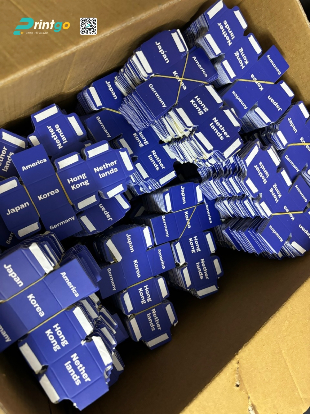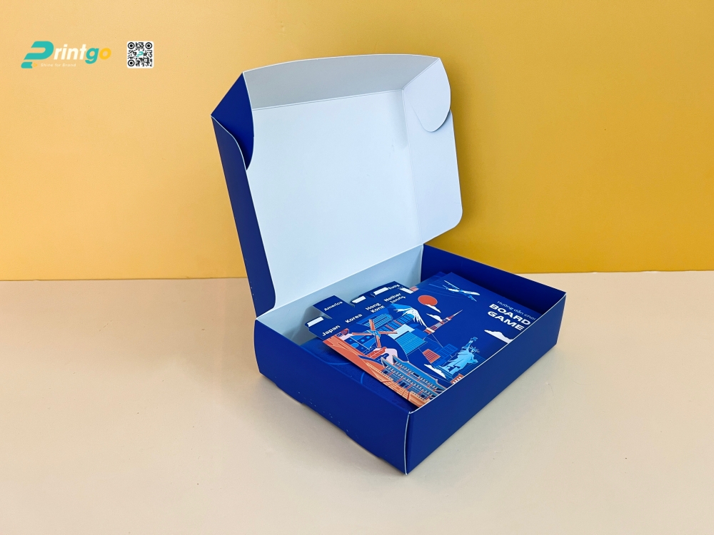 Hộp đựng board game: Khác với hộp quà Tết cứng cáp, hộp board game được Printgo tư vấn sử dụng quy cách hộp mềm nắp gài hai bên hông. Đây là loại hộp có thể được trải phẳng ra trên một mặt phẳng duy nhất. Ưu điểm vượt trội của quy cách này là tối ưu cho việc vận chuyển và lưu kho. Hàng ngàn chiếc hộp có thể được vận chuyển phẳng, và khi cần sử dụng, nhân viên chỉ cần vài thao tác gập đơn giản là có thể dựng thành hộp hoàn chỉnh, tiết kiệm chi phí logistics đáng kể, đặc biệt là khi gửi quà đi toàn cầu.