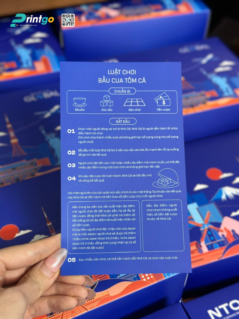 Với mối quan hệ đối tác đã được xây dựng và kiểm chứng chất lượng qua nhiều dự án trước đó, Printgo được NTQ "chọn mặt gửi vàng", tin tưởng giao phó vai trò đối tác đồng hành sản xuất trọn gói. Chúng tôi đảm nhận toàn bộ quy trình, từ việc tiếp nhận ý tưởng, phát triển chủ đề, thiết kế board game, in hộp đựng quà Tết, gia công thành phẩm, cho đến khi bàn giao một bộ sản phẩm hoàn chỉnh, sẵn sàng cho hành trình chinh phục toàn cầu.