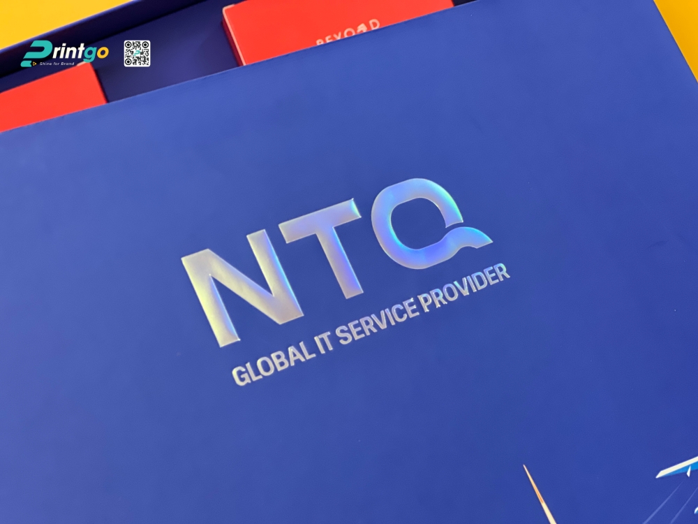 Cuối cùng, để tạo điểm nhấn nhận diện, kỹ thuật gia công ép kim logo được lựa chọn. Trên nền xanh mờ của hộp đựng quà tết và túi giấy, logo NTQ được ép kim màu bạc nổi bật. Đây là kỹ thuật dùng nhiệt và khuôn kim loại để ép một lớp màng kim loại lên giấy, tạo ra hiệu ứng lấp lánh, phản quang mà không một công nghệ in ấn nào có thể thay thế, khẳng định đẳng cấp của thương hiệu.