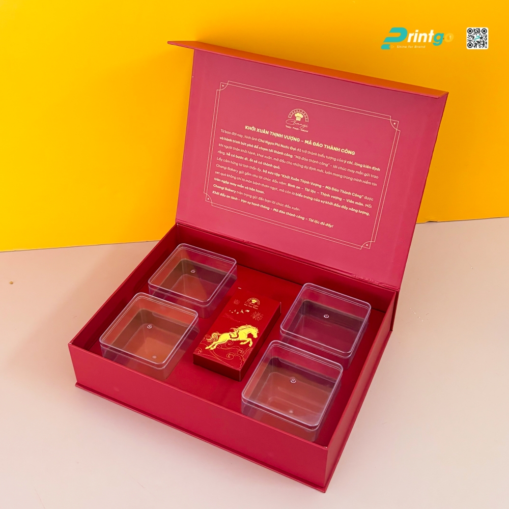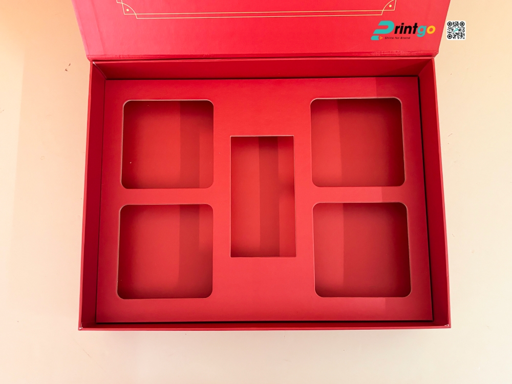 Bên trong hộp, Printgo thiết kế khay định hình (khay dưỡng) được bế khuôn chính xác theo kích thước của từng hộp bánh con. Khay này được làm cùng chất liệu với vỏ hộp, giúp cố định sản phẩm chắc chắn, không bị xô lệch hay va đập khi di chuyển. Việc dán cố định khay vào đáy hộp đảm bảo khi món quà đến tay người nhận, mọi thứ vẫn nằm ngay ngắn, trật tự, thể hiện sự trân trọng tối đa của người tặng.
