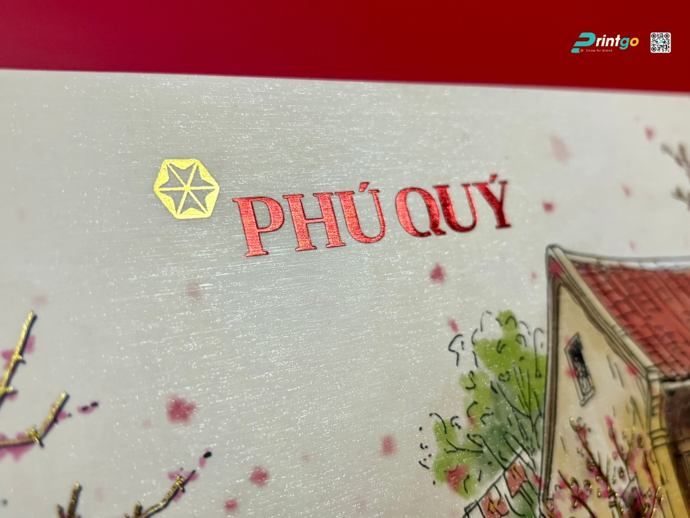 Phối hợp nhịp nhàng trên nền màng tơ tằm sang trọng ấy là kỹ thuật ép kim foil vàng nhiệt độ cao trên toàn bộ phần mặt trước của hộp. Cụm logo thương hiệu "PHÚ QUÝ" cùng những họa tiết điểm xuyết rải rác trên nền tranh được ép nhũ lấp lánh với độ nhiệt và lực ép được Printgo căn chỉnh chuẩn xác đến từng milimet. Hiệu ứng này tạo ra sự tương phản ánh sáng mạnh mẽ, lôi cuốn ánh nhìn và tôn vinh triệt để giá trị của thương hiệu kim hoàn danh tiếng.