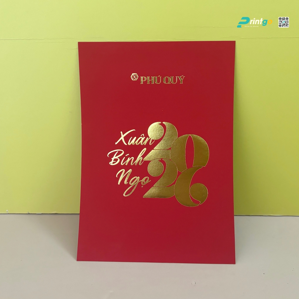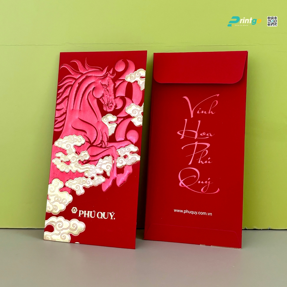 Mảnh ghép hoàn thiện đỉnh cao của toàn bộ dự án quà tặng nằm ở chiếc bao lì xì 3D và tấm thiệp tri ân được Printgo chế tác từ dòng giấy mỹ thuật cao cấp mang sắc đỏ nhung nguyên bản. Bằng việc ứng dụng kỹ thuật thúc nổi 3D đa tầng phức tạp để tạo hình chú ngựa Bính Ngọ hiên ngang giữa những áng mây bồng bềnh, kết hợp cùng chi tiết ép kim dòng chữ thư pháp "Vinh Hoa Phú Quý", chúng tôi đã biến một chiếc bao lì xì tưởng chừng quen thuộc thành một tác phẩm điêu khắc giấy thực thụ.