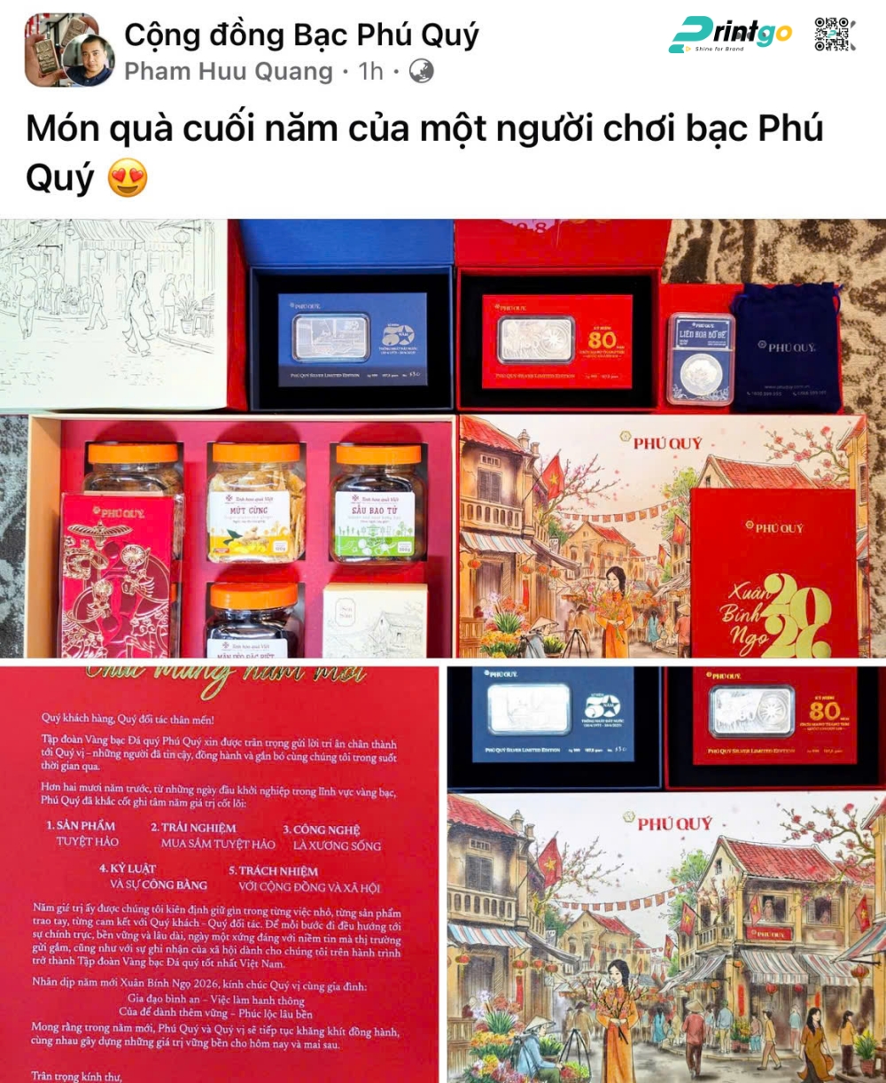 Việc Tập đoàn Phú Quý tiếp tục tin tưởng và giao phó toàn bộ dự án thiết kế hộp quà tết lẫn gia công in hộp quà tết này cho Printgo là một minh chứng đắt giá cho mối quan hệ hợp tác chiến lược thành công. Sự thấu hiểu sâu sắc DNA của thương hiệu, cùng khả năng đáp ứng hoàn hảo những tiêu chuẩn sản xuất kỹ thuật cao đã giúp Printgo tự hào được song hành cùng Phú Quý kiến tạo nên những dấu ấn truyền thông vang dội qua nhiều mùa chiến dịch liên tiếp.