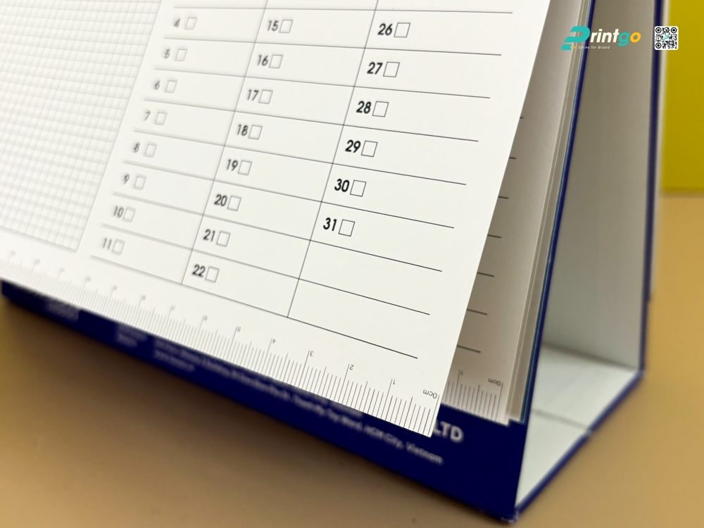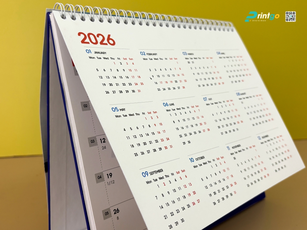 Trang lịch tháng: Grid System chuẩn mực. Phần ruột lịch 12 tháng là linh hồn của ấn phẩm. Printgo thiết kế hệ thống lưới lịch (Grid System) thoáng đãng với các ô số lớn, rõ ràng. Chúng tôi kết hợp song song cả Lịch Dương và Lịch Âm một cách tinh tế. Các ngày lễ quan trọng của Việt Nam và Quốc tế đều được đánh dấu màu đỏ nổi bật, giúp người dùng dễ dàng lên kế hoạch nghỉ lễ hay công tác. Font chữ sử dụng là loại Sans-serif hiện đại, nét đều, đảm bảo khả năng đọc (readability) tốt nhất ngay cả khi nhìn từ xa.