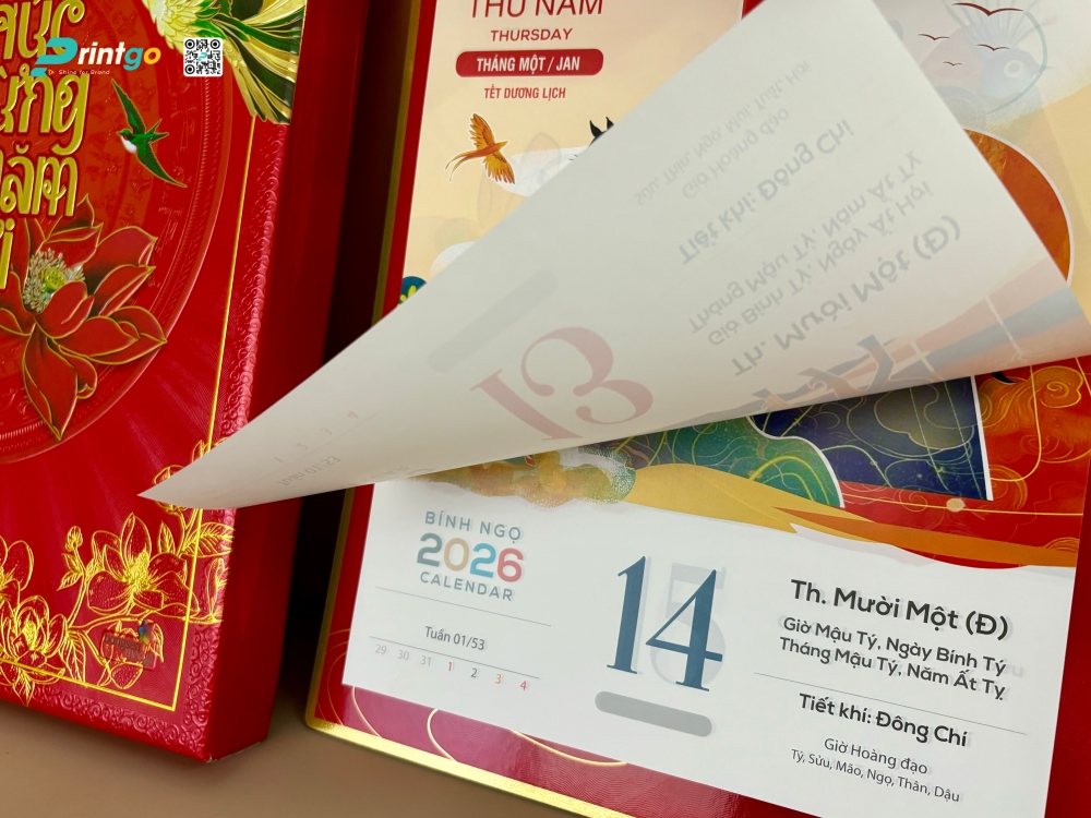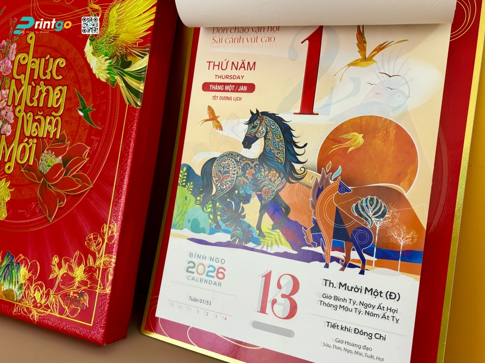 Những đổi mới về quy cách này giúp món quà Tết của doanh nghiệp trở nên khác biệt, tạo ấn tượng sâu sắc và tăng giá trị nhận diện thương hiệu. Dù nhu cầu của bạn là một bộ lịch truyền thống sang trọng hay một thiết kế độc quyền, sáng tạo, Printgo đều sẵn sàng tư vấn và hiện thực hóa. Quý khách hàng có nhu cầu tư vấn, thiết kế và in lịch tết cho doanh nghiệp, vui lòng liên hệ ngay với Printgo qua Hotline/Zalo: 0901.633.313 để được đội ngũ chuyên gia của chúng tôi hỗ trợ chi tiết.