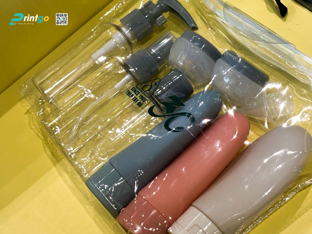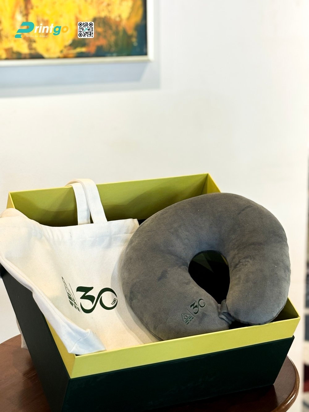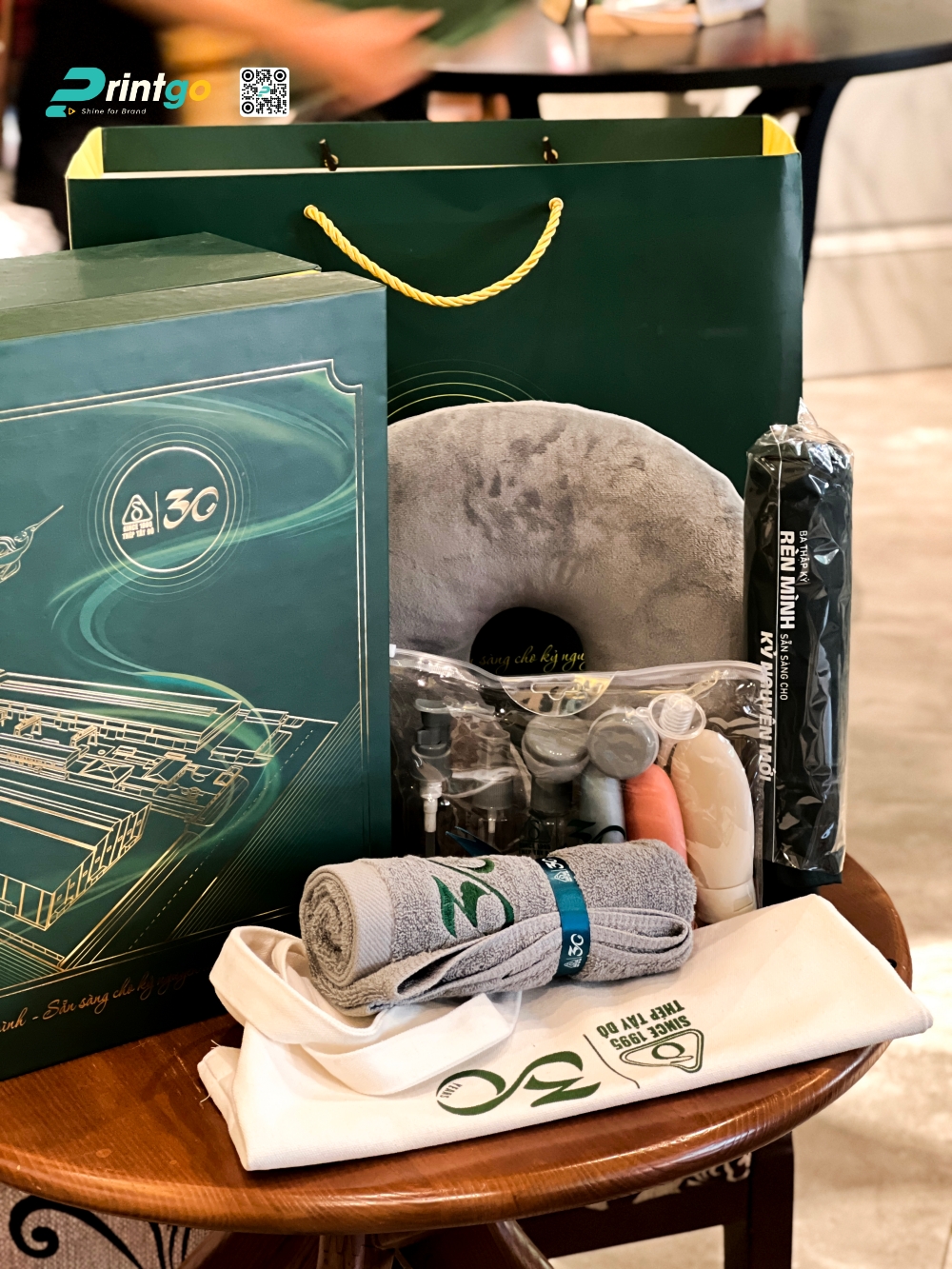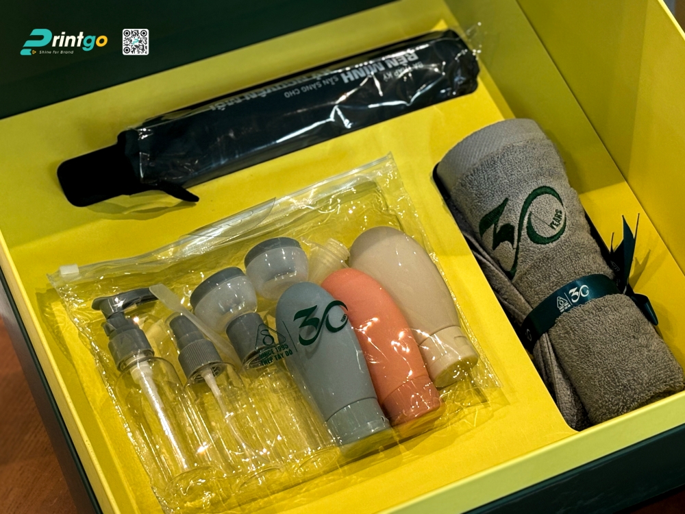 Bộ vật phẩm bên trong được Printgo chọn lọc kỹ lưỡng theo tiêu chí “hữu ích – nhận diện – lưu giữ”. Các sản phẩm như gối cổ hơi, bịt mắt, bộ chiết mỹ phẩm hay thẻ hành lý (luggage tag) đều là những vật dụng thiết yếu cho những chuyến công tác hay du lịch, gợi nhắc về sự đồng hành của Thép Tây Đô trên mọi nẻo đường. Chiếc ô (dù) gấp gọn với màu xanh thương hiệu không chỉ che mưa nắng mà còn mang ý nghĩa về sự che chở, bảo vệ – giống như tính chất an toàn của thép.