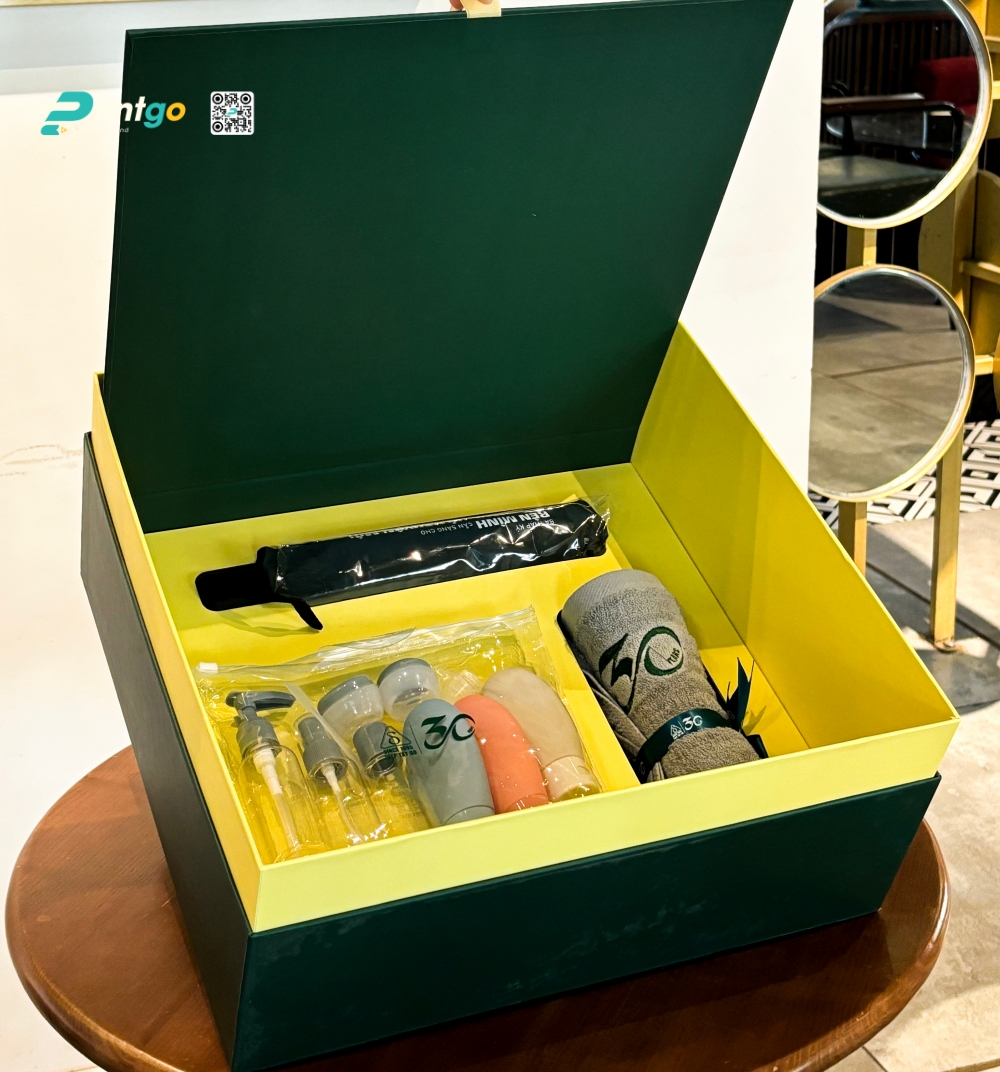 Để nâng tầm đẳng cấp cho hộp quà, kỹ thuật gia công ép kim vàng (gold foil stamping) được áp dụng cho các chi tiết logo và họa tiết chủ đạo. Kỹ thuật này sử dụng khuôn kim loại và nhiệt độ cao để ép lớp nhũ vàng lên bề mặt giấy, tạo hiệu ứng phản quang lấp lánh, sang trọng mà in ấn thông thường không thể làm được. Đồng thời, toàn bộ bề mặt hộp được cán màng mờ (matte lamination), giúp bảo vệ lớp mực in, chống trầy xước và tạo chiều sâu cho thiết kế, mang lại cảm giác mịn màng, dễ chịu khi chạm vào. Bên trong hộp là khay định hình được bế khuôn chính xác theo kích thước từng sản phẩm, giúp cố định vật phẩm ngay ngắn, tránh xô lệch trong quá trình vận chuyển.