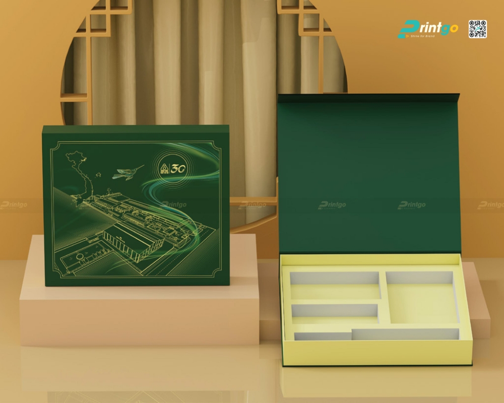 Về quy cách, Printgo tư vấn sử dụng kiểu dáng hộp nắp lật nam châm sang trọng. Đây là quy cách hộp cao cấp, sử dụng nam châm âm ẩn bên trong để giữ nắp hộp đóng mở một cách chắc chắn nhưng vẫn nhẹ nhàng, tạo cảm giác "đầm tay" và trải nghiệm mở hộp đầy thú vị. Chất liệu được chúng tôi tin dùng là giấy Couche bồi carton lạnh. Carton lạnh là loại vật liệu có độ cứng cao, đanh, mịn như gỗ, giúp hộp vuông vức, sắc cạnh và chịu lực cực tốt, bảo vệ an toàn tuyệt đối cho các vật phẩm bên trong.