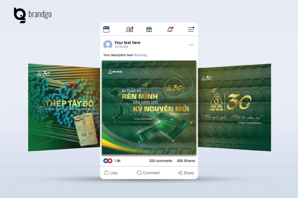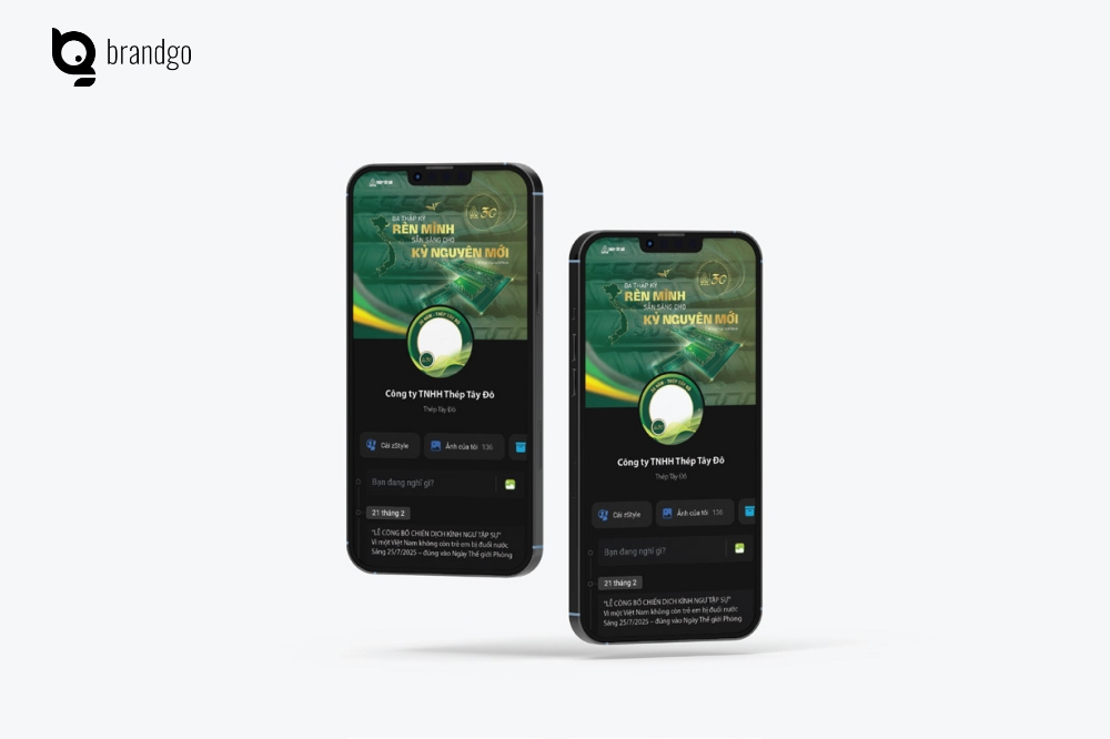 Với vai trò là đơn vị tư vấn và triển khai giải pháp thương hiệu, Brandgo không dừng lại ở việc thiết kế đồ họa đơn thuần mà đi sâu vào tư vấn định hướng hình ảnh. Mục tiêu của chúng tôi là kể lại câu chuyện hành trình 30 năm của Thép Tây Đô bằng một ngôn ngữ thiết kế hiện đại, mạnh mẽ nhưng vẫn giữ được nét gần gũi. Các hạng mục triển khai trên nền tảng số bao gồm ảnh đại diện và khung avatar Facebook đồng bộ để lan tỏa không khí lễ hội đến từng nhân viên, cùng với hệ thống ảnh bìa (cover) mang thông điệp “Ba thập kỷ rèn mình – Sẵn sàng cho kỷ nguyên mới”.