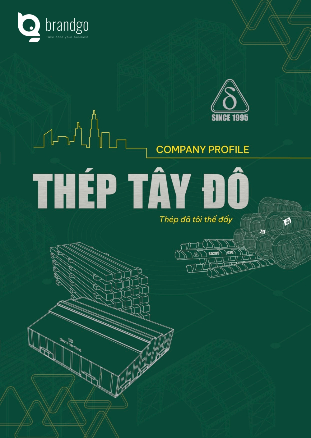 Đặc biệt, ấn phẩm Profile doanh nghiệp phiên bản kỷ niệm là một điểm nhấn quan trọng, được thiết kế để tái hiện hành trình phát triển từ 1995 đến 2025. Ngôn ngữ thiết kế chủ đạo được Brandgo sử dụng là phong cách đồ họa kỹ thuật (blueprint) làm nền, gợi nhớ đến những bản vẽ kết cấu thép chi tiết và chuẩn xác. Những đường line-art mảnh mai nhưng dứt khoát, kết hợp với hiệu ứng chuyển động của các dải năng lượng xanh – vàng, đã khắc họa thành công quá trình “rèn luyện – chuyển mình – vươn xa” của Thép Tây Đô. Typography được lựa chọn là những phông chữ không chân, dày dặn, mang tinh thần công nghiệp hiện đại và niềm tự hào nghề nghiệp kiêu hãnh.
