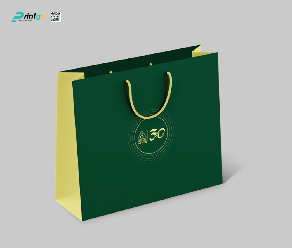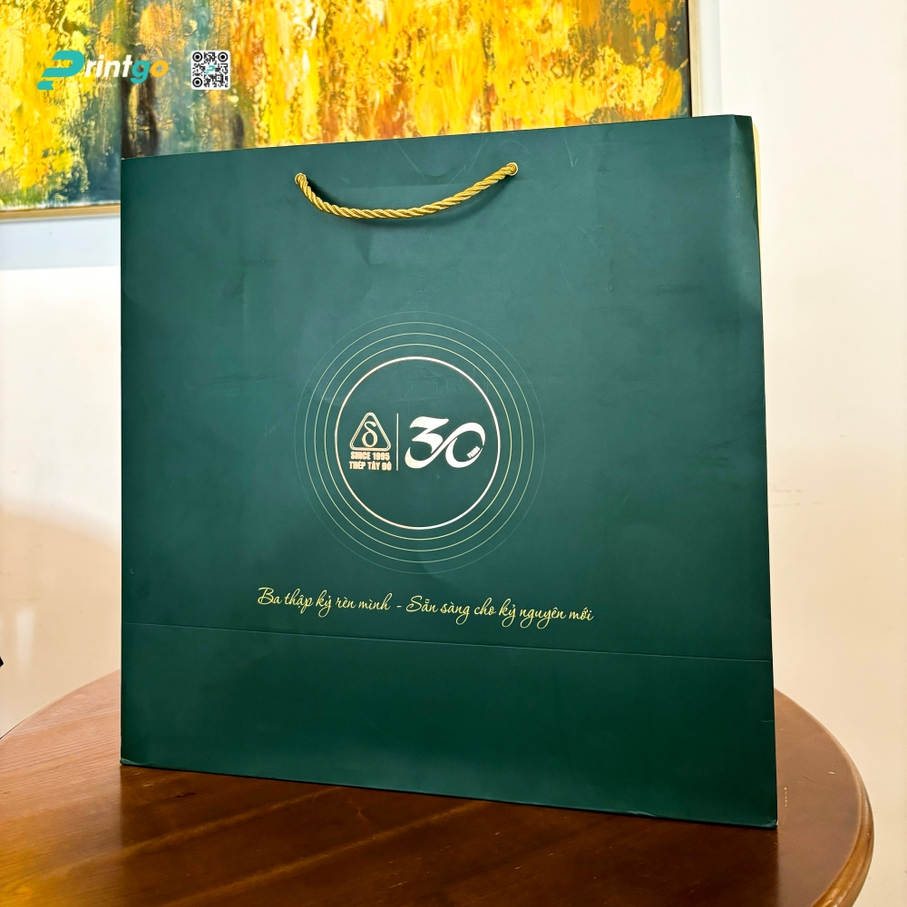 Túi giấy đi kèm cũng được thiết kế đồng bộ với màu sắc và họa tiết của hộp quà, sử dụng logo 30 năm làm điểm nhấn trung tâm. Chúng tôi lựa chọn giấy Ivory định lượng cao cho túi giấy. Giấy Ivory có đặc tính dày dặn, độ đàn hồi tốt và bề mặt trắng mịn, giúp tái hiện màu sắc in ấn một cách trung thực và rực rỡ nhất, đồng thời đảm bảo khả năng chịu lực tốt khi đựng trọn bộ quà tặng nặng tay.