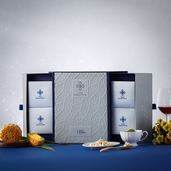 Bộ sưu tập hộp bánh trung thu khách sạn Daewoo 2019 gồm có hộp 4 bánh, 6 bánh, 6 bánh kèm trà và 6 bánh kèm rượu vang đỏ. Tất cả các mẫu hộp bánh trung thu của khách sạn Daewoo 2019 đều được thiết kế và in ấn theo quy cách hộp nắp mở cánh bướm. Chất liệu hộp được làm từ chất liệu chính là giấy carton lạnh cứng cáp, chắc chắn. Để xây dựng cũng như quảng bá thương hiệu, ở chính giữa hộp bánh trung được thiết kế logo thương hiệu khách sạn Daewoo nổi bật.