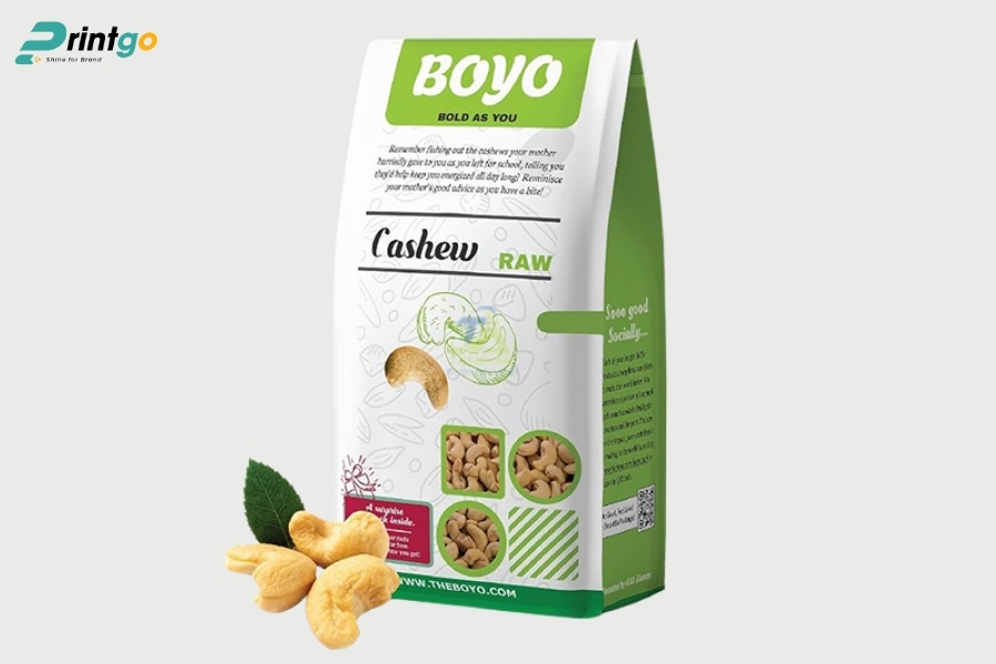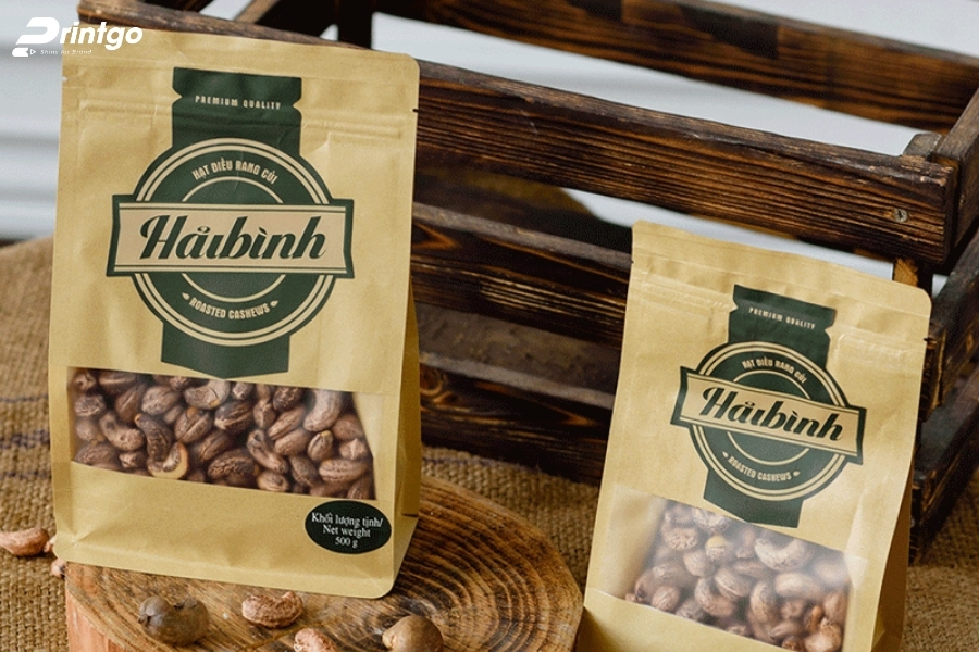 Thiết kế túi đứng với dây kéo zip, tạo cảm giác sang trọng và tiện lợi. Chất liệu thường là giấy kraft. Dung tích phổ biến từ 200g – 500g, phù hợp với nhà bán lẻ hạt điều cao cấp.