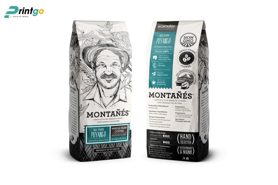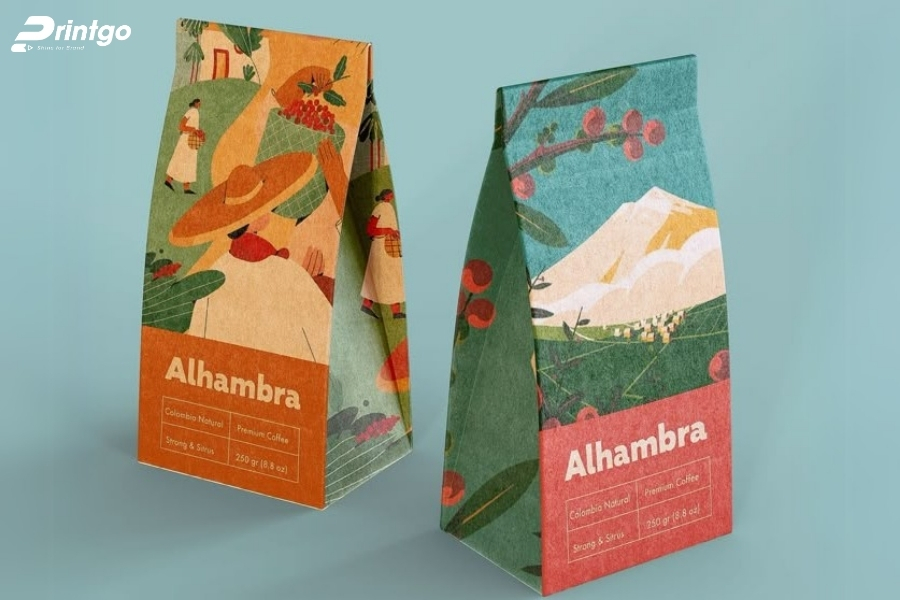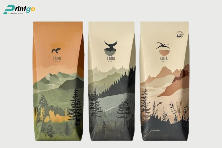 Sử dụng giấy tái chế hoặc màng sinh học PLA phân hủy nhanh, in mực thực vật. Thiết kế tối giản, không phủ bóng để dễ phân hủy. Trọng lượng chứa khoảng 200g – 500g, đáp ứng xu hướng xanh.