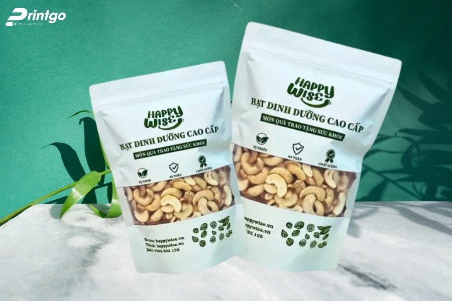 Túi zip đáy đứng là lựa chọn tiện lợi và hiện đại, vừa giúp bảo quản hạt điều luôn giòn thơm, vừa dễ dàng mở ra – đóng lại nhiều lần. Với thiết kế chắc chắn, đứng vững trên kệ, loại bao bì này không chỉ đẹp mắt mà còn tạo sự chuyên nghiệp cho thương hiệu.