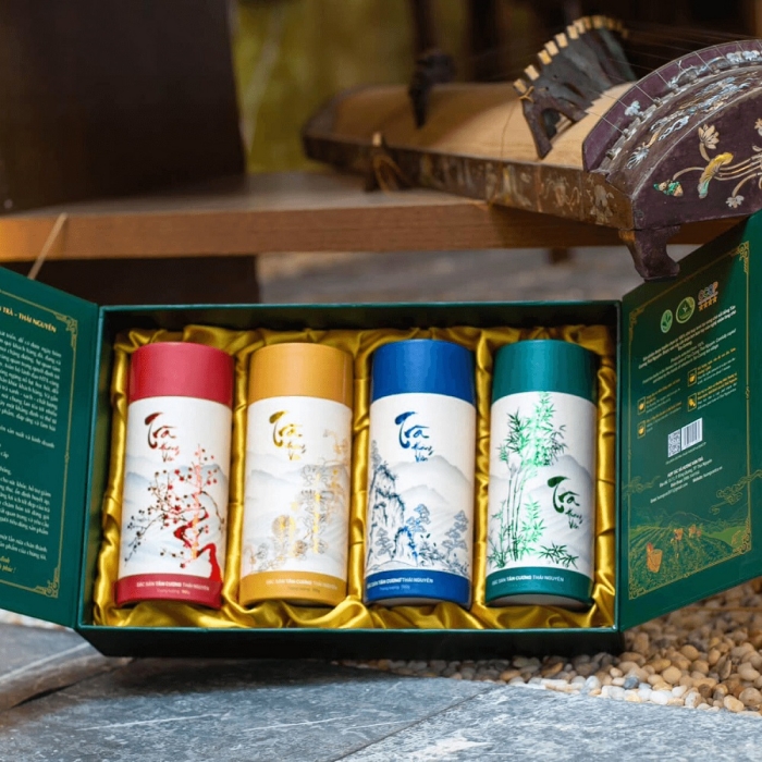 Bên cạnh công năng, loại hộp này còn có thể tái sử dụng nhiều lần, mang lại cảm giác sang trọng và nâng cao giá trị sản phẩm. Thiết kế kết hợp giữa giấy in cao cấp và ánh kim loại của nắp thiếc tạo nên nét hiện đại, lịch lãm, đặc biệt phù hợp với khách hàng có gu thẩm mỹ tinh tế và phân khúc trà cao cấp.