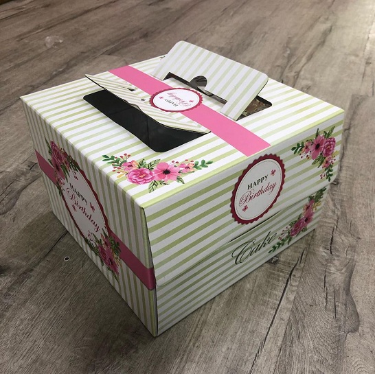Mẫu hộp đựng bánh kem sọc hoa 25cm x 25cm x 18cm sử dụng chất liệu bìa cứng với mặt ngoài được in họa tiết. Đặc điểm của chất liệu hộp cứng cáp, giúp giữ kiểu dáng hộp chắc chắn, có thể giúp bảo quản bánh bên trong tránh khỏi các ảnh hưởng của môi trường khi vận chuyển, lưu trữ. Với thiết kế nắp gài ở 2 cạnh bên, việc đặt bánh vào và lấy bánh ra cũng được thực hiện dễ dàng hơn. Đồng thời, trên bề mặt của hộp còn được thiết kế 2 quai xách bằng bìa cứng gắn liền với thân hộp, người sử dụng có thể cầm nắm, di chuyển dễ dàng bằng 1 tay mà không cần sử dụng thêm túi hay bê bằng 2 tay.