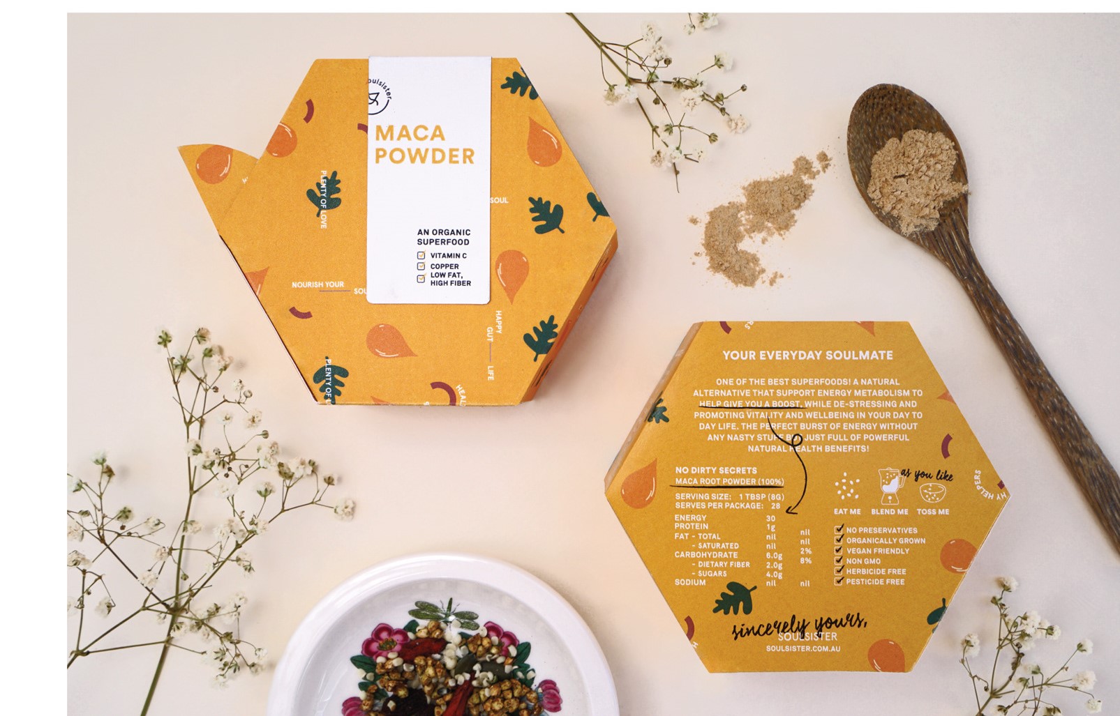 Hộp giấy DAP-PB 000235 là mẫu hộp giấy có thiết khá đơn giản. Với thoi hộp lục giác đều quen thuộc, mẫu hộp được trang trí với những họa tiết hoa lá khá nhẹ nhàng, cùng màu vàng cam làm chủ đạo khiến chiếc hộp càng trở nên nổi bật. Cũng giống như đặc trưng của mẫu hộp giấy thông thường, DAP-PB 000235 có diện tích bề mặt khá lớn, doanh nghiệp có thể in tên thương hiệu cũng như những thông tin phụ về sản phẩm một cách dễ dàng. Điểm đặc biệt trong mẫu thiết kế này là phần nắp mở. Thay vì loại nắp rời thường thấy, DAP-PB 000235 được thiết kế với một phần nắp gạt nhỏ ở cạnh hộp, để người dùng có thể trực tiếp sử dụng sản phẩm bên trong một cách tiện lợi hơn. Với chủ đề trang trí cũng như điểm nhấn của thiết kế nhằm đem lại trải nghiệm khác biệt cho người dùng, DAP-PB 000235 sẽ là mẫu hộp giấy phù hợp dành cho những sản phẩm hạt dinh dưỡng hoặc ngũ cốc ăn sáng,…