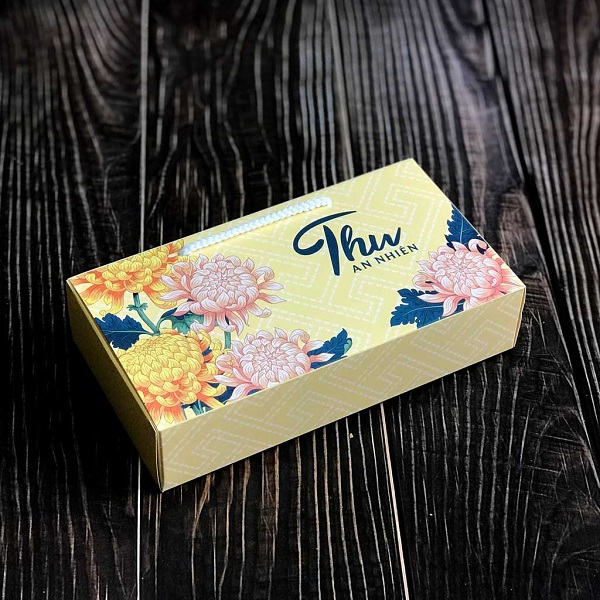 Hộp giấy đựng 2 bánh trung thu FIK-PB 010001 là mẫu hộp giấy có thiết kế cổ điển, sử dụng những họa tiết hoa truyền thống với màu sắc nhẹ nhàng, kèm theo thông điệp "Thu An Nhiên" mang ý nghĩa chúc một mùa trung thu an lành. Hơn nữa, kết cấu của mẫu hộp FIK-PB 010001 còn tạo sự thuận tiện cho khách hàng sử dụng với nắp đóng mở và quai xách. Nếu quý khách đang cần tìm kiếm mẫu thiết kế hoặc in hộp giấy đựng 2 bánh trung thu với thiết kế cố điển, nhẹ nhàng mang đậm nét truyền thống và thuận tiện sử dụng, vận chuyển thì FIK-PB 010001 chắc chắc sẽ là mẫu hộp phù hợp nhất.