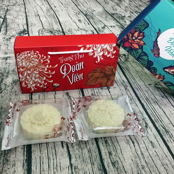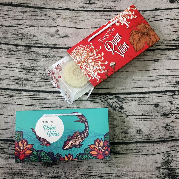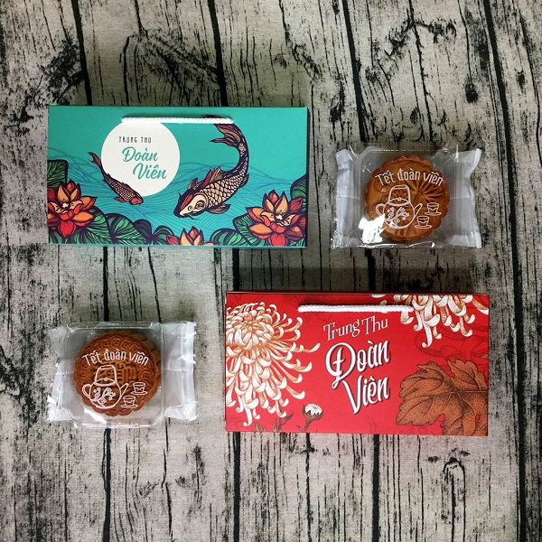 Dòng chữ "Trung Thu Đoàn Viên” sử dụng font chữ uốn lượn được thiết kế ở chính giữa, tạo điểm nhấn nổi bật cho bề mặt hộp bên cạnh các hình ảnh, họa tiết hoa cúc. Sự kết hợp của dòng chữ và các hình ảnh, họa tiết trên bề mặt hộp mang ý nghĩa chúc một mùa trung thu đoàn viên và cũng mang đến cảm giác trang nhã, lịch sự.
