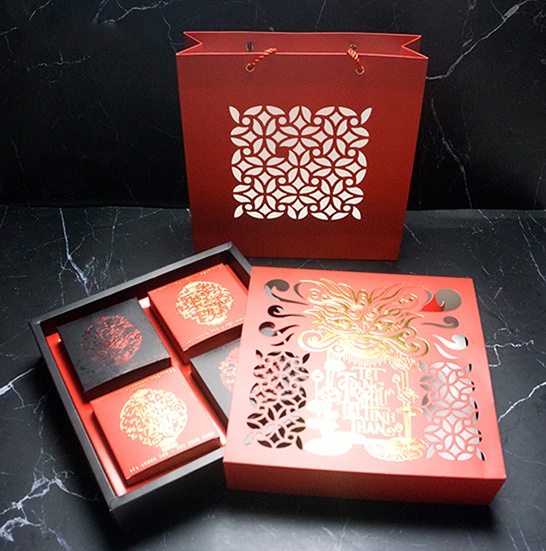 Mẫu hộp bánh Trung thu NANH – PB 010037 thể hiện vẻ đẹp sang trọng, quý phái của mình bằng việc lựa chọn tông màu đỏ đậm truyền thống làm tông màu chủ đạo cho thiết kế. Khắc họa rõ nét nhất cho vể đẹp ấn tượng, khác biệt của mình, mẫu hộp bánh được tỉ mỉ gia công các chi tiết khắc laser nghệ thuật tạo thành các họa tiết trang trí thủ công đẹp mắt, điệu đà có thể nhìn thấy sản phẩm nằm bên trong.