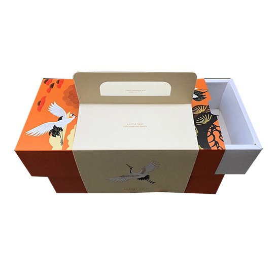 Mẫu hộp SNAM-PB 010034 có quy cách sắp xếp sáng tạo khi sử dụng 2 khay hộp chữ nhật, mỗi khay đựng vừa 2 bánh Trung thu có trọng lượng 125 – 150g. Hai khay hộp sẽ được xếp chồng lên nhau, kết hợp với quai cầm bọc ngoài vô cùng chắc chắn, nhỏ gọn vừa thuận tiện cho việc di chuyển vừa mang ý đồ nghệ thuật đặc sắc khi thiết kế lựa chọn tông màu kem vô cùng đồng điệu với sắc cam rực rỡ của hộp bánh.