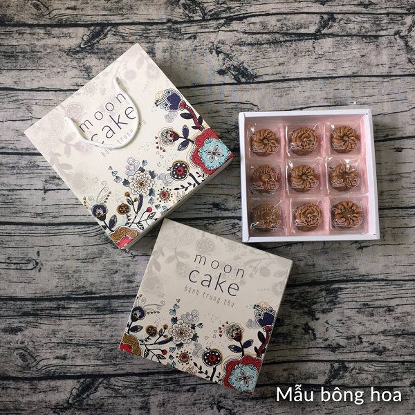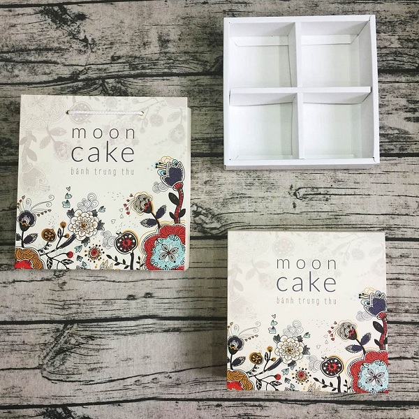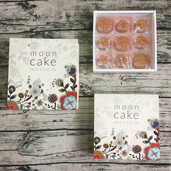 Sự kết hợp họa tiết hoa đối xứng, màu nền trắng đơn giản kèm dòng chữ "Moon Cake - bánh Trung Thu" được in chính giữa đem đến sự tinh tế, hiện đại. Có thể sử dụng hộp làm hộp quà biếu tặng hay kinh doanh tùy theo mục đích sử dụng.
