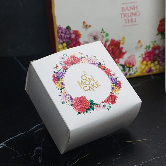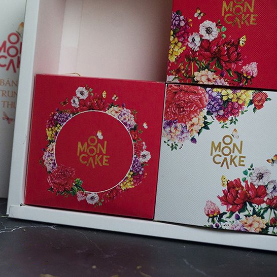 Họa tiết hoa mẫu đơn nhiều màu sắc không chỉ được điểm tô ở hộp đựng ngoài, mà từng hộp đựng bánh con bên trong cùng đều sử dụng với các sắp xếp bố cục khác nhau vô cùng sinh động, linh hoạt. Chính giữa mẫu thiết kế nổi bật là dòng chữ “Moon Cake” cũng được cách điệu sao cho phù hợp với vẻ ngoài nữ tính, trang nhã của thiết kế.