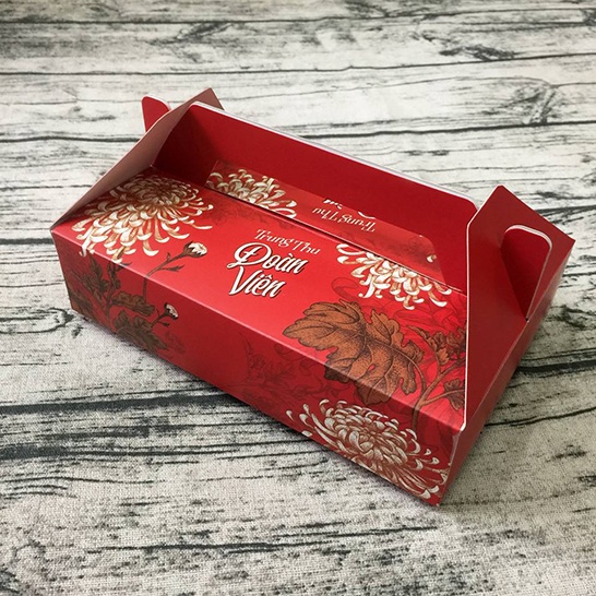 Mẫu hộp bánh SNAM-PB 010045 đem trên mình những chi tiết như hình ảnh những bông cúc vạn thọ cách điệu, vẻ đẹp uyển chuyển của những chú cá chép được in tí mỉ, chi tiết từng đường nét. Họa tiết trang trí của mẫu hộp bánh thực sự thu hút, mang đậm tính nghệ thuật. Hình ảnh biểu tượng kết hợp với mẫu chữ “Đoàn Viên” nhằm truyền tải thông điệp quan trọng, khiến bất cứ ai nhìn thấy cũng muốn mau chóng trở về nhà, đoàn tụ cùng gia đình trong dịp lễ Trung thu.