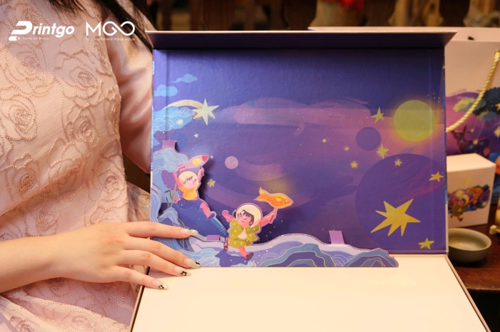 Điểm nhấn ấn tượng của Mộng Ca còn nằm ở hình in popup 3D, tạo nên hiệu ứng sống động và tinh xảo đến từng đường nét. Nhờ vậy, người nhận có thể đắm chìm trong không gian văn hóa đêm trăng rằm, cảm nhận được sự tỉ mỉ và tâm huyết trong từng chi tiết. Để tăng thêm vẻ sang trọng và thu hút, các chi tiết trên mặt nắp hộp được ép kim kết hợp bồi giấy màng metalize toàn bộ, mang lại hiệu ứng thị giác ấn tượng và vẻ ngoài lấp lánh cho bao bì.