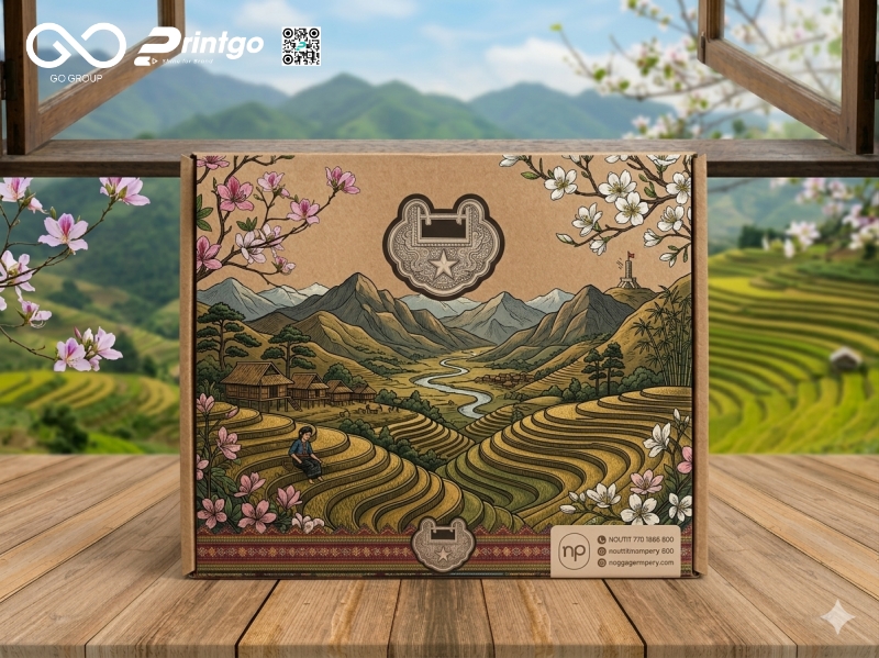 Về chất liệu, hộp sử dụng giấy couche bồi carton lạnh cao cấp, mang đến sự kết hợp giữa tính thẩm mỹ và độ bền vượt trội. Bề mặt giấy couche mịn, khả năng bắt màu tốt giúp hình ảnh đặc trưng vùng núi Tây Bắc được thể hiện rõ nét, sống động và đồng đều. Trong khi carton lạnh lại đóng vai trò như lớp lõi cứng cáp, giúp hộp giữ form ổn định, hạn chế móp méo trong quá trình vận chuyển. Để hoàn thiện tổng thể bao bì, doanh nghiệp có thể cân nhắc ứng dụng các kỹ thuật gia công như cán màng, phủ UV họa tiết hoặc ép kim, giúp tăng độ sắc nét cho chi tiết, làm nổi bật logo và tạo hiệu ứng ánh sáng bắt mắt, từ đó nâng tầm hình ảnh cho thương hiệu.