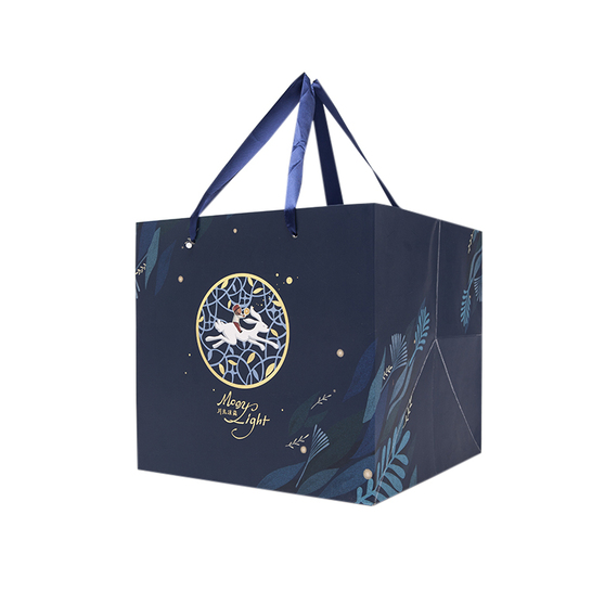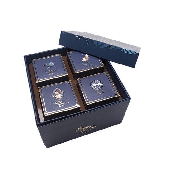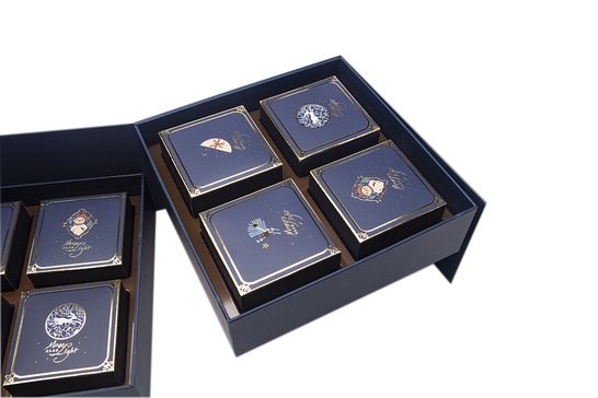 Hộp bánh trung thu 2 tầng PG-TT2T-01 được thiết kế với tông màu xanh dương tượng trưng cho màn đêm, điểm xuyến trong màn đêm này là những ngôi sao sáng lấp lánh và hình ảnh chú thỏ ngọc được ép kim vàng nổi bật. Hộp bánh trung thu 2 tầng PG-TT2T-01 được thiết kế theo quy cách hộp âm dương gồm 2 phần nắp hộp và phần thân hộp, phân thân hộp bánh được chia thành 2 tầng với mỗi tầng chứa 4 hộp bánh trung thu con. Bên trong mỗi khay đựng bánh đều được trang bị khay định hình giúp bảo vệ các hộp con bên trong luôn ngay ngắn, không bị xô lệch trong quá trình vận chuyển, mang đi biếu tặng.