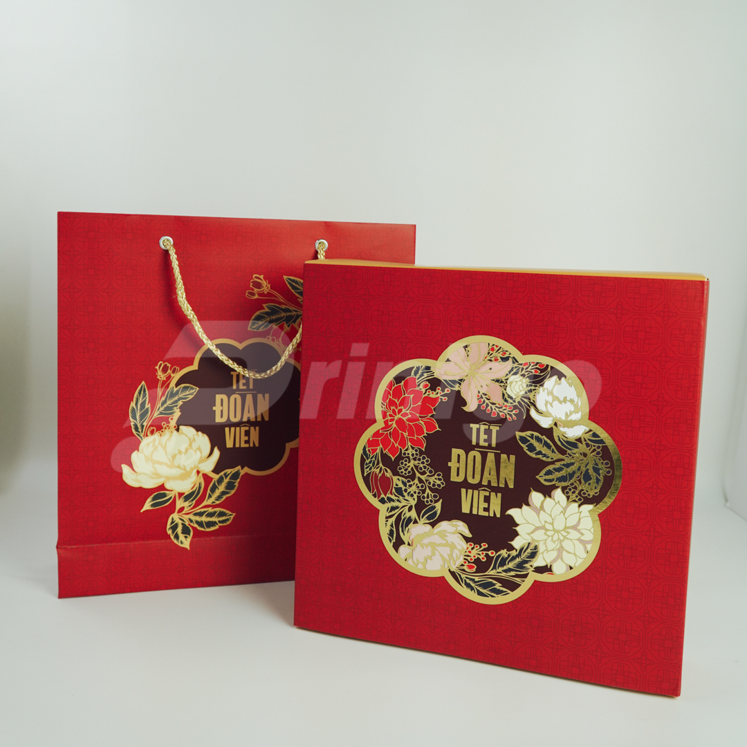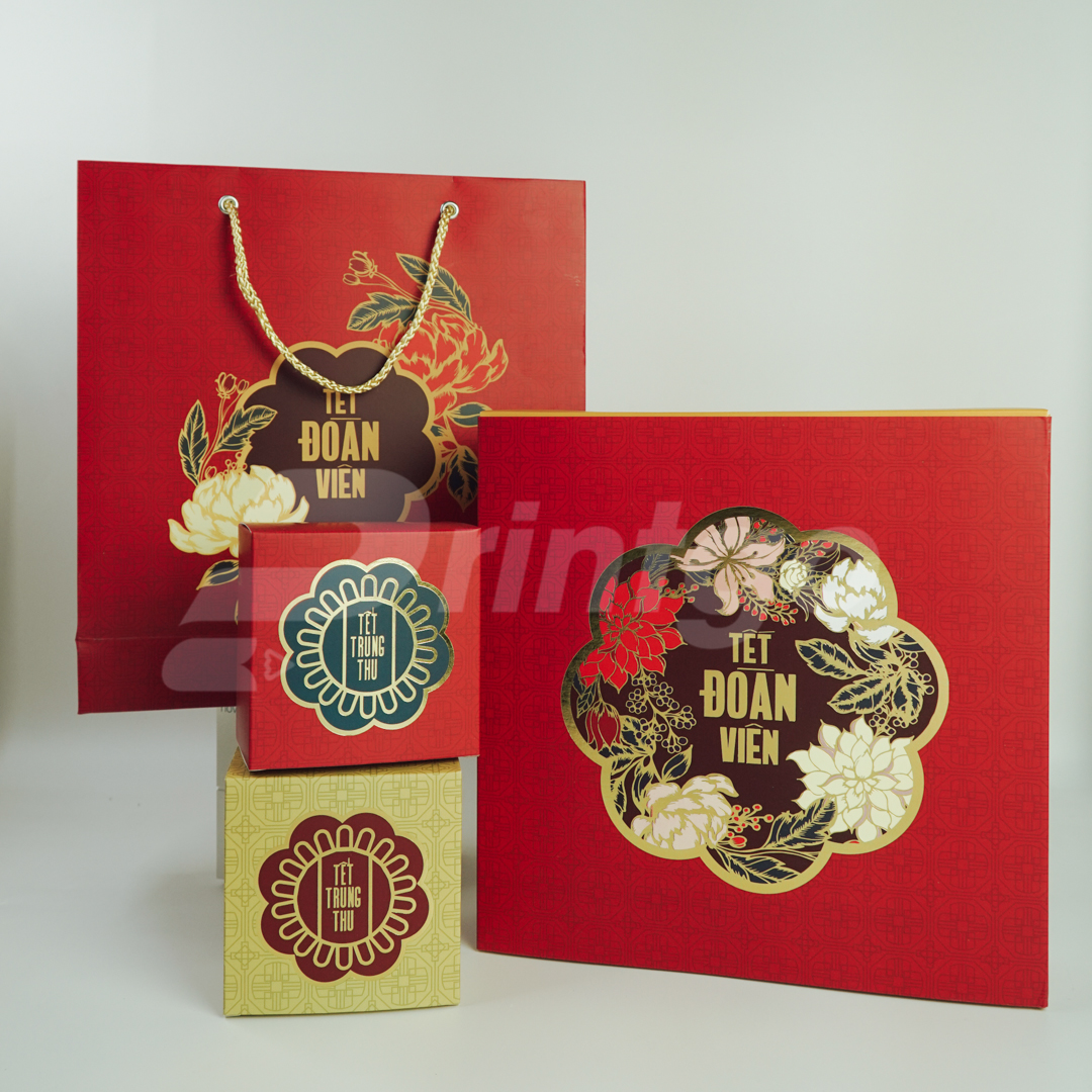 Trên nắp hộp bánh và túi xách có khách hàng có thể tùy chọn in ép kim logo, tên thương hiệu ở chính giữa hoặc để theo thiết kế gốc là dòng chữ "Tết đoàn viên", như một lời nhắc nhở mọi người tranh thủ trở về nhà trong ngày tết trông trăng đoàn tụ cùng gia đình bên mâm cơm, cùng phá cỗ với các em nhỏ dưới ánh trăng đêm rằm.