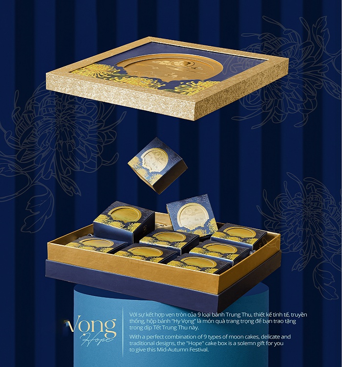 Điểm nhấn của hộp bánh trung thu lần này chắc chắn phải kể đến họa tiết được in ấn tỉ mỉ trên bề mặt bao bì. Những bông hoa cúc trắng đua nhau nở dưới ánh trăng trong vành vạnh mang một vẻ đẹp thanh cao, biểu tượng cho đức tính tốt đẹp của người dân Việt Nam “trung - tín - hiếu - nghĩa”. Hơn nữa, nó còn tượng trưng cho một mùa trung thu viên mãn, đoàn kết, gia đình sum họp trong ngày lễ hội truyền thống.
