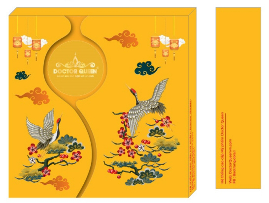 Từ yêu cầu của Doctor Queen đối với thiết kế hộp bánh trung thu: độc quyền và sang trọng. Các nhà thiết kế của Printgo hôm đã lấy ý tưởng từ bộ hoàng bào (áo của vua chúa) thời xưa với các chi tiết chim hạc và mai đỏ, màu vàng chủ đạo. Mẫu hộp bánh trung thu đã toát lên vẻ cao quý từ những chi tiết nhỏ nhất, nâng giá trị cho món quà.