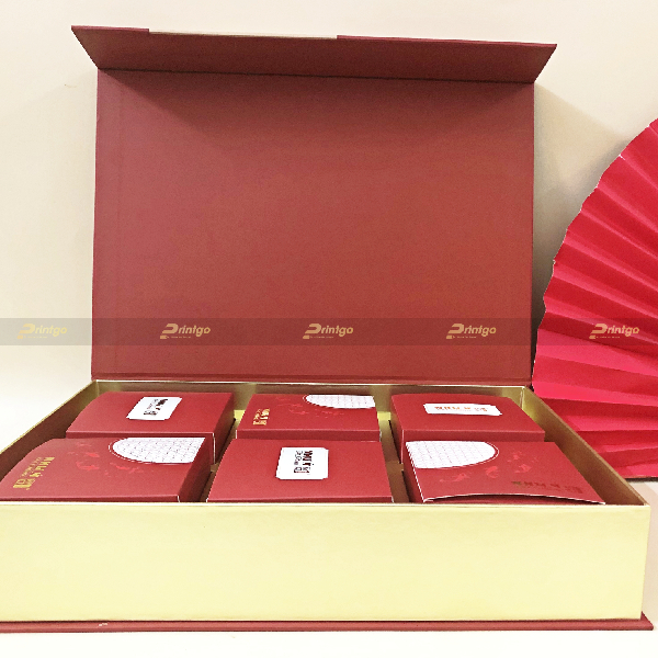 Bên cạnh yếu tố bao bì hộp bánh trung thu thì chất lượng và tính ứng dụng là “mắt xích” quan trọng tạo nên sự khác biệt và thành công cho sản phẩm. Vậy nên khi sản xuất ấn phẩm hộp trung thu Như Ý đỏ 6 bánh PG-TT22-44, Printgo sử dụng dòng hộp nam châm nắp lật đứng - Một trong những loại hộp cao cấp nhất trong lĩnh vực sản xuất, in hộp giấy. Diện tích bên trong hộp rỗng rãi, có thể đóng mở dễ dàng nhờ vào lực hút của nam châm, phù hợp đựng bánh trung thu từ 150gr.