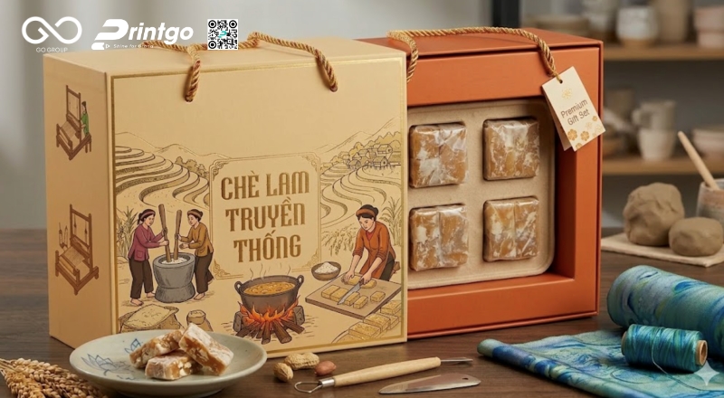 Mỗi sản phẩm đặc sản đều mang theo giá trị riêng, và với chè lam, một thức quà dân dã gắn liền với văn hóa ẩm thực truyền thống, bao bì chính là yếu tố giúp câu chuyện ấy được truyền tải trọn vẹn hơn khi đến tay người tiêu dùng. Chính vì vậy, việc đầu tư một mẫu hộp phù hợp không chỉ nâng cao giá trị cảm nhận mà còn tạo dấu ấn rõ nét cho sản phẩm trên thị trường. Nắm bắt điều đó, Printgo phát triển mẫu hộp bao diêm rút có quai xách đựng đặc sản chè lam với thiết kế tinh gọn, tiện dụng và giàu tính thẩm mỹ, góp phần giúp sản phẩm nổi bật hơn khi trưng bày và tạo ấn tượng ngay từ lần tiếp xúc đầu tiên.