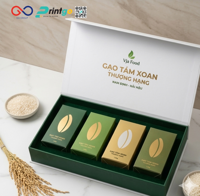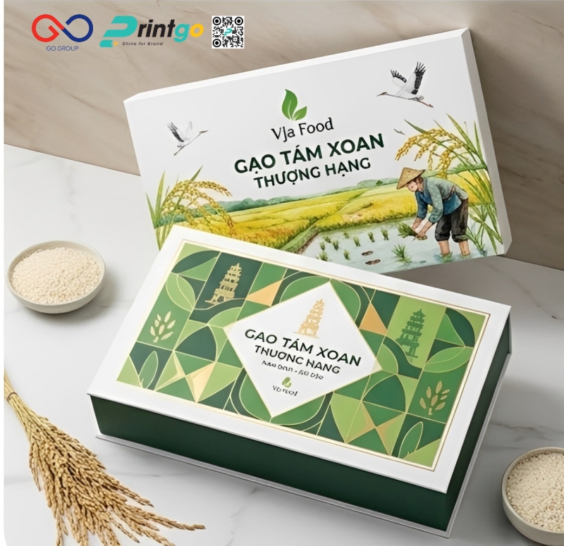 Không chỉ là một loại gạo ngon, gạo tám xoan Hải Hậu còn mang theo câu chuyện về thổ nhưỡng, khí hậu và kinh nghiệm canh tác lâu đời của người dân vùng ven biển Nam Định. Khi giá trị sản phẩm ngày càng được khẳng định, bao bì trở thành yếu tố quan trọng giúp truyền tải trọn vẹn chất lượng và bản sắc ấy đến người tiêu dùng. Nắm bắt được điều ấy, Printgo phát triển mẫu hộp cánh bướm đựng gạo tám xoan Hải Hậu, góp phần tạo nên diện mạo chỉn chu, khác biệt và phù hợp với các kênh trưng bày, quà tặng hiện đại.