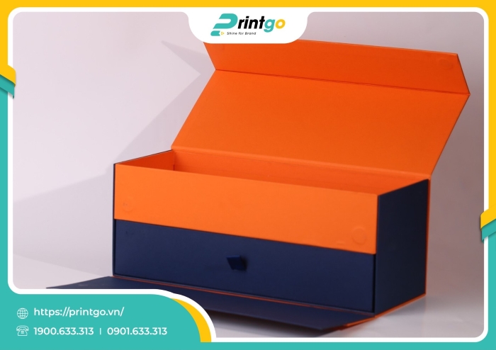 Hộp cứng sở hữu phần nắp lật thuận tiện, dễ dàng thao tác đóng mở hộp. Tích hợp thêm phần nam châm tạo độ chắc chắn, đảm bảo cho sản phẩm bên trong. Với quy cách 2 tầng hiện đại, hộp cứng có sức chứa lớn nhờ vào không gian rộng rãi, tách biệt. Phần khay đựng carton cứng cáp được thiết kế vừa vặn với sản phẩm. Khay dưới kết hợp ruy băng rút, tựa như ngăn tủ dễ dàng thao tác lấy sản phẩm bên trong.
