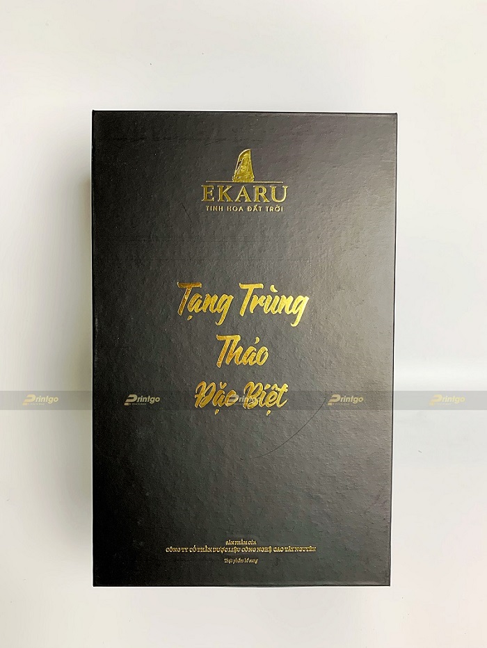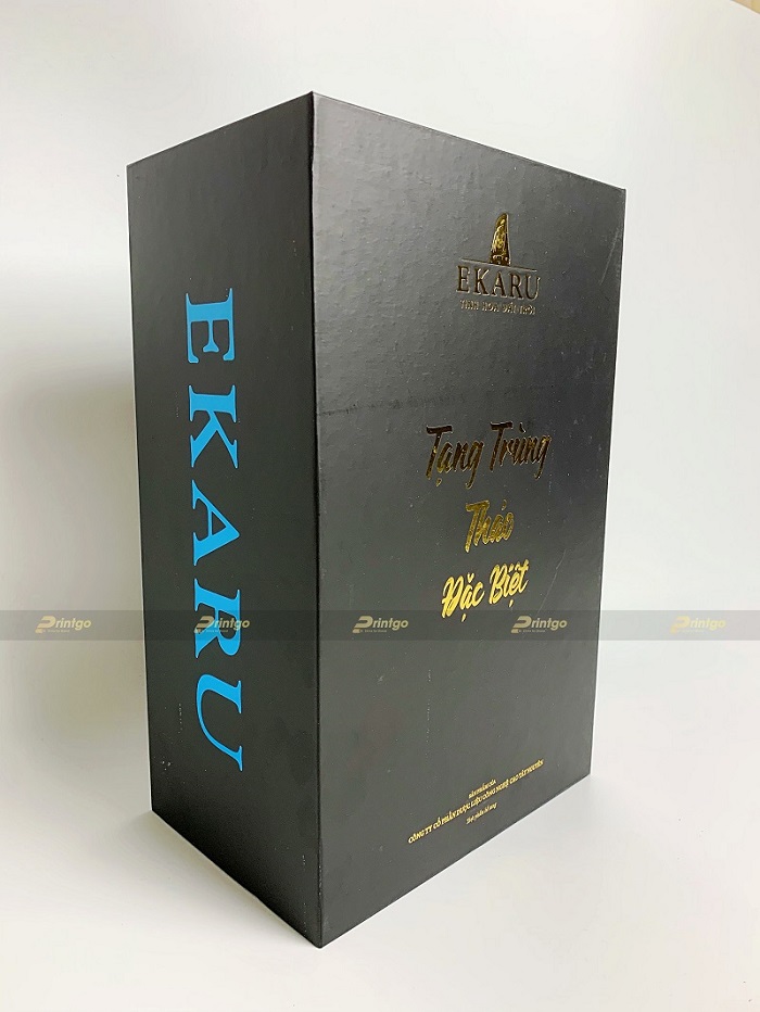 Ấn phẩm Ekaru PG-HDR22-30 sử dụng chất liệu carton lạnh 2mm, cho ra thành phẩm cứng cáp, chắc chắn, có bề ngoài gọn gàng và vuông vức. Bên ngoài các miếng carton lạnh được bồi thêm một lớp giấy Couche 150gsm bên ngoài, giúp cho sản phẩm có độ chắn sáng tốt, mực in đồng đều và bám chặt trên bề mặt giấy. Trên bề mặt hộp gia công ép kim vàng toàn bộ thông tin thương hiệu, tên sản phẩm giúp dễ dàng thu hút sự chú ý của người tiêu dùng.