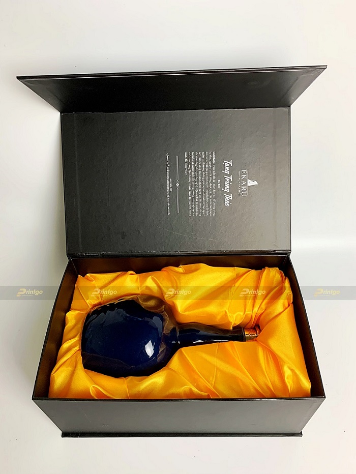 Bên trong hộp là khay định hình được làm từ xốp bọt biển, bên trên phủ lớp lụa vàng làm tăng tính thẩm mỹ cho sản phẩm. Khay được tạo khuôn theo hình dạng của chai rượu giúp cố định chai tốt hơn, hạn chế va đập dẫn đến vỡ, gãy trong quá trình vận chuyển và lưu kho.