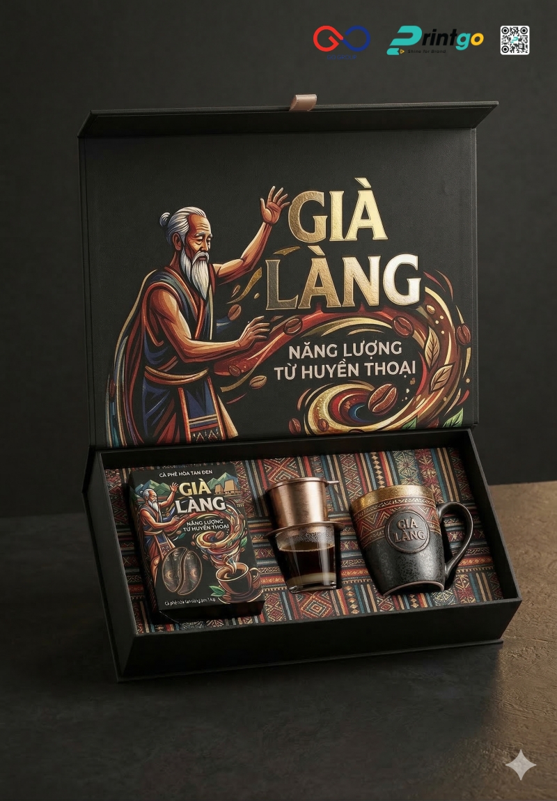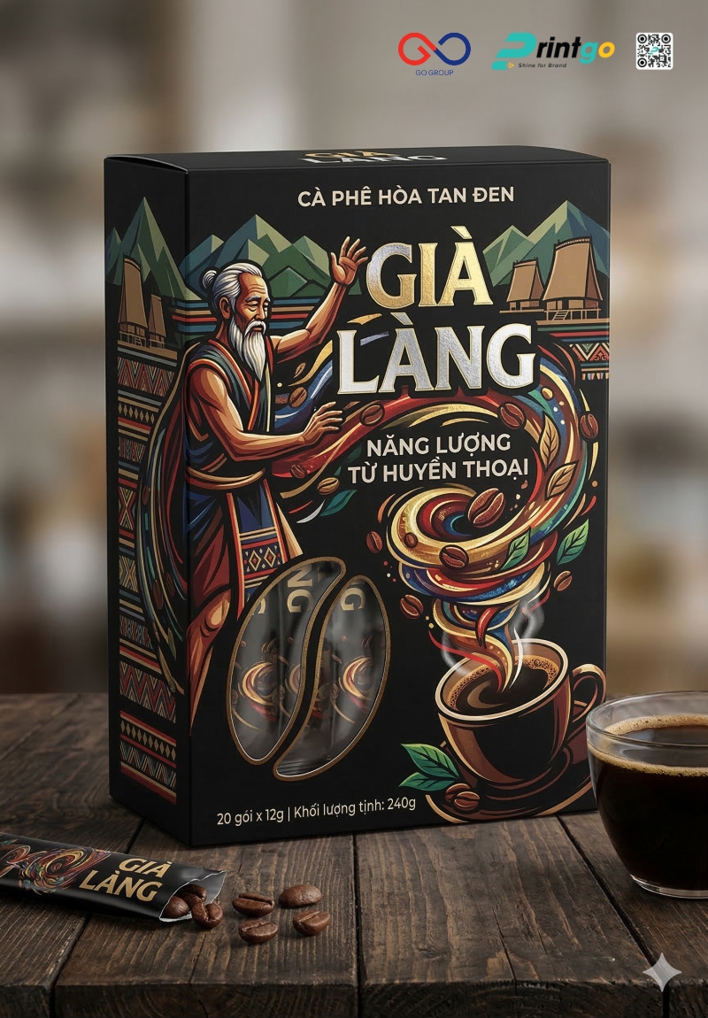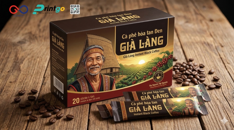 Cà phê hòa tan Đen Già Làng mang theo tinh thần Tây Nguyên qua từng chi tiết, từ hương vị đậm đà đến câu chuyện văn hóa được gửi gắm phía sau sản phẩm. Khi hướng đến trải nghiệm trọn vẹn cho người dùng, bao bì trở thành yếu tố mở đầu giúp định hình cảm nhận ngay từ lần tiếp xúc đầu tiên. Một thiết kế phù hợp sẽ giúp sản phẩm thể hiện rõ giá trị, tạo sự chỉn chu trong từng điểm chạm và gia tăng ấn tượng khi được lựa chọn làm quà tặng. Printgo mang đến giải pháp in hộp giấy cao cấp, giúp doanh nghiệp hoàn thiện diện mạo sản phẩm và xây dựng hình ảnh thương hiệu rõ nét hơn trên thị trường.