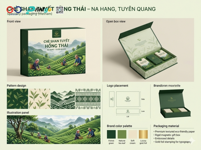 Lấy cảm hứng từ những đồi chè Shan Tuyết trải dài tại vùng cao Na Hang - Tuyên Quang, thiết kế bao bì tái hiện sinh động bức tranh thiên nhiên hùng vĩ cùng nhịp sống lao động mộc mạc của người dân bản địa. Hình ảnh người nông dân thu hái chè vừa mang giá trị thẩm mỹ, vừa thể hiện rõ nguồn gốc tự nhiên, quy trình sản xuất thủ công và chất lượng nguyên bản của sản phẩm.