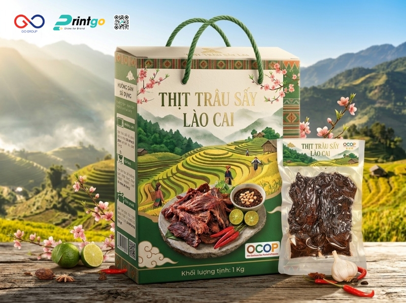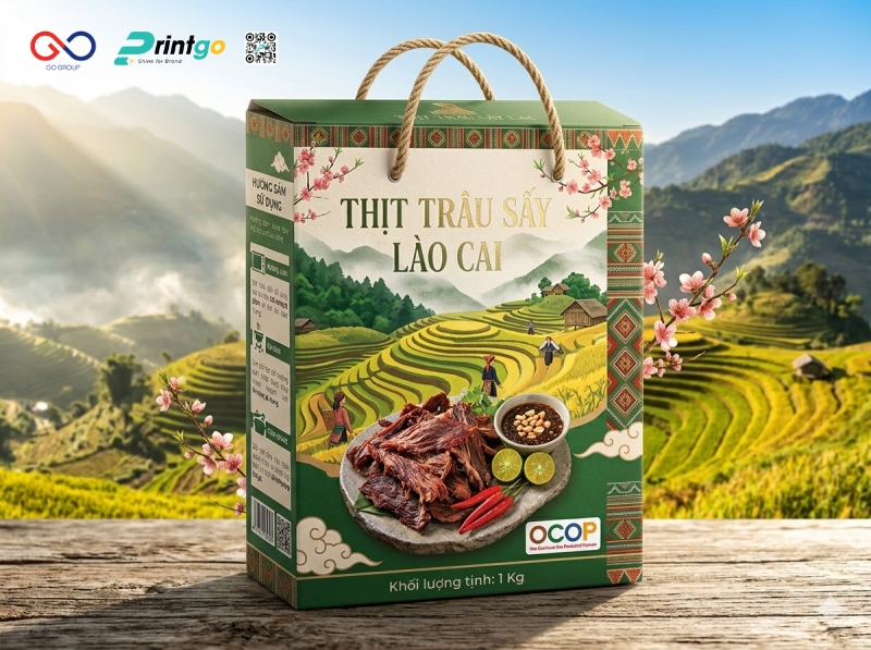 Thịt trâu sấy Lào Cai từ lâu đã khẳng định vị thế là “tinh hoa ẩm thực” Tây Bắc, trở thành món quà biếu thượng hạng nhờ giá trị dinh dưỡng và hương vị gác bếp đặc trưng. Tuy nhiên, để một sản phẩm OCOP tự tin vươn tầm, diện mạo bao bì cần được đầu tư tương xứng với chất lượng bên trong. Thấu hiểu điều đó, Printgo mang đến giải pháp in hộp giấy đựng thịt trâu sấy Lào Cai với thiết kế tinh tế và kết cấu bền chắc, giúp sản phẩm được bảo quản tối ưu, đồng thời nâng cao hình ảnh thương hiệu trong mắt khách hàng.