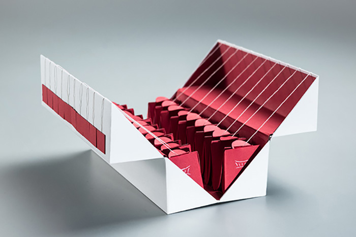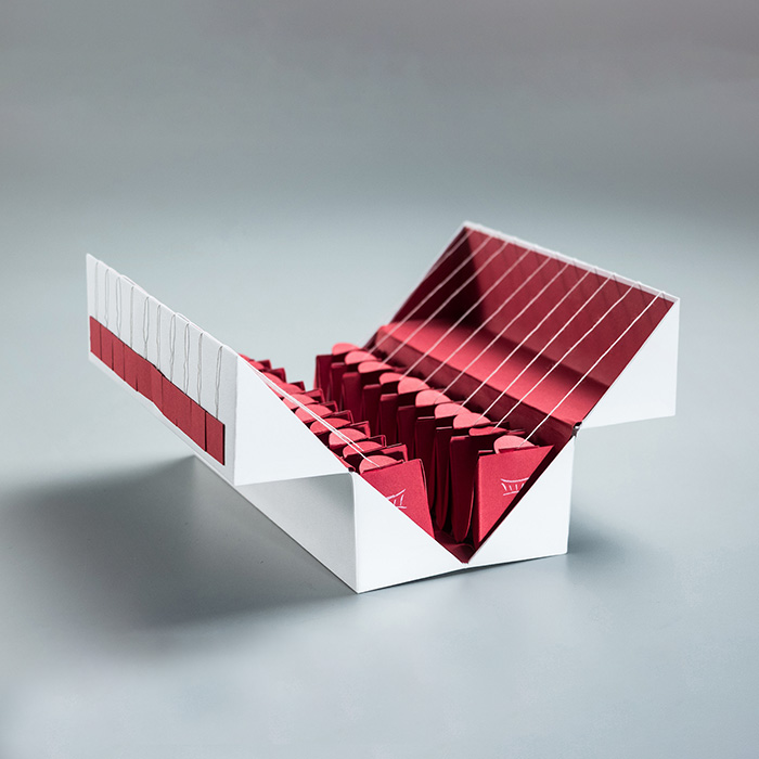 Hộp giấy đựng trà cao cấp PG-HT23-62 được nhà thiết kế lấy cảm hứng từ cầu treo Bitan, bằng cách mở hộp ra, người ta có thể nhìn thấy hình ảnh cây cầu. Mỗi sợi dây gắn với từng gói trà tượng trưng cho những cáp treo rủ xuống với khoảng cách song song đều nhau đỡ lấy từng đốt bản mặt cầu. Các gói trà riêng biệt được bọc trong túi giấy đỏ như những trụ cột giữ vững chắc cho cả cây cầu.