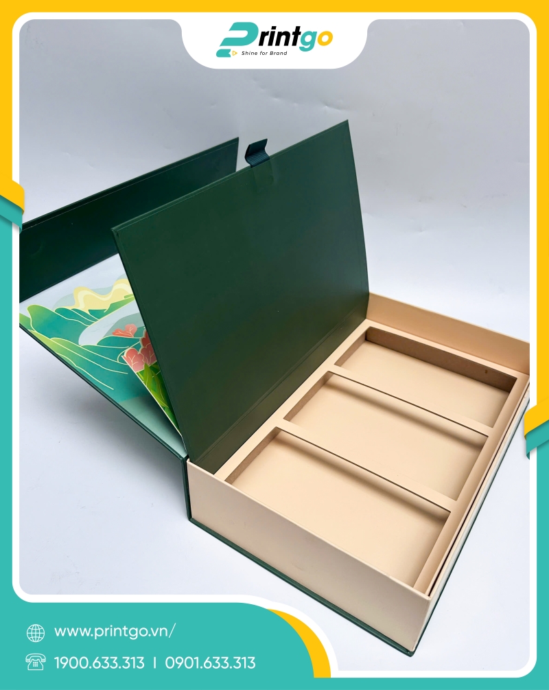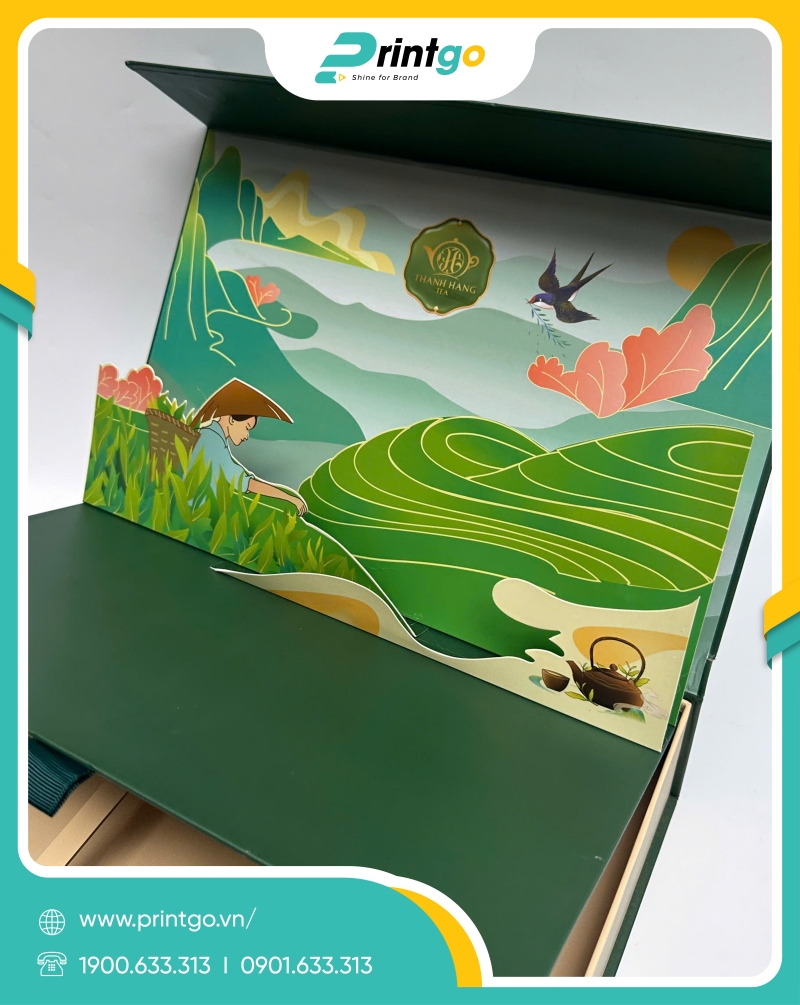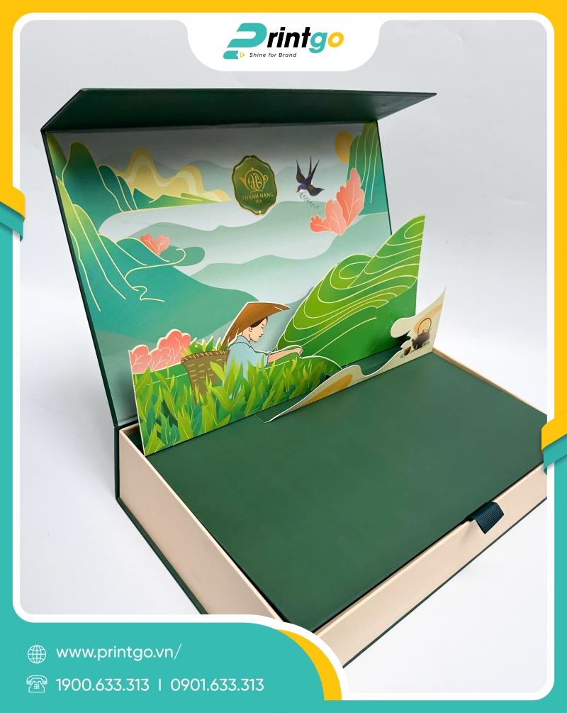 Printgo đã lựa chọn quy cách hộp nam châm nắp lật cho hộp trà Thanh Hằng để tạo ra sự tiện lợi và ấn tượng ngay từ lần đầu tiên sử dụng. Hộp được thiết kế với nắp phụ bên trong có hiệu ứng pop-up 3D ba lớp, tạo nên một không gian nổi bật khi mở nắp. Hiệu ứng này không chỉ khiến hộp trà trở nên sinh động mà còn mang lại một trải nghiệm thú vị và bất ngờ cho người sử dụng.
