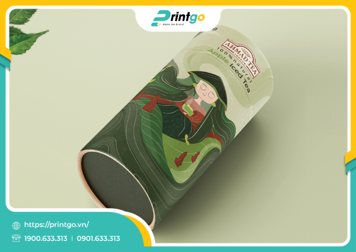 Mẫu in hộp đựng trà được thiết kế theo quy cách hộp trụ tròn, một kiểu dáng bao bì đặc biệt giúp nâng tầm giá trị sản phẩm. Hộp có cấu trúc gồm hai phần chính là phần nắp hộp và thân hộp. Phần nắp được thiết kế ngắn hơn và có đường kính lớn hơn phần thân, tạo độ khít chặt giúp việc đóng mở thuận tiện mà vẫn đảm bảo chắc chắn, hạn chế nắp bị bung trong quá trình sử dụng. Với thiết kế hình trụ, hộp không chỉ bảo vệ sản phẩm tối ưu mà còn giúp việc sắp xếp, trưng bày và vận chuyển trở nên dễ dàng, đồng thời tiết kiệm không gian hơn.